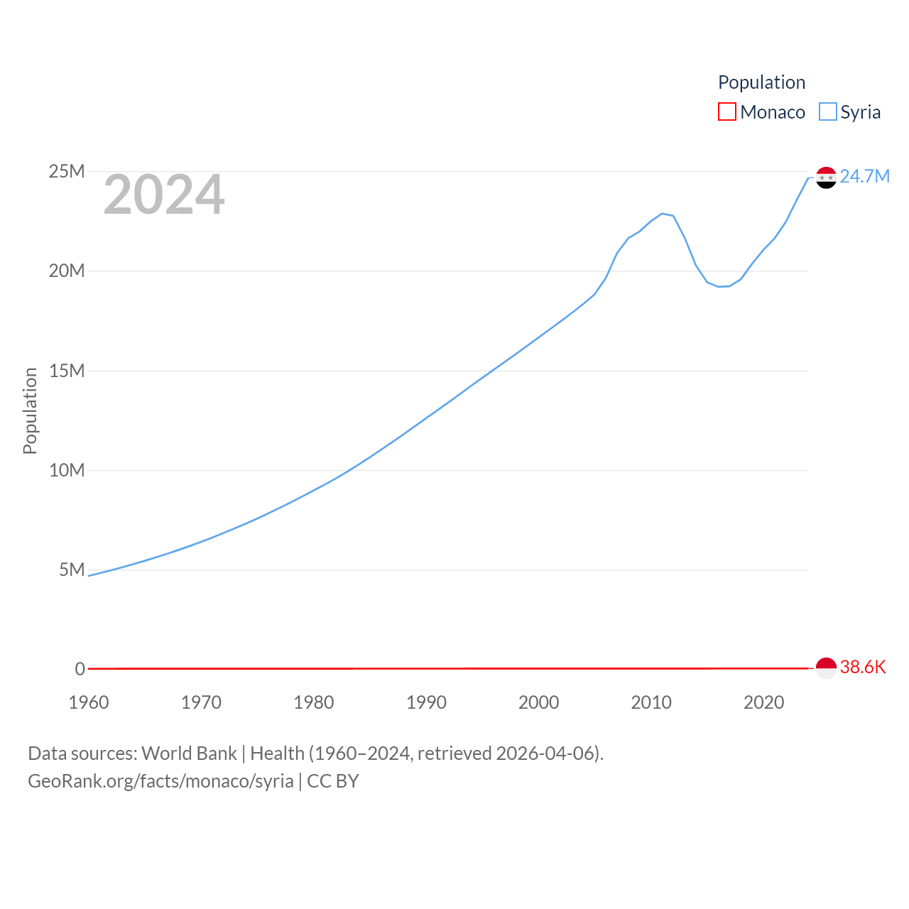 Monaco has a population of 38.6K (ranked 191/197), compared with 24.7M in Syria (ranked 57/197). Monaco's land area is 0.8 sq mi versus 70,900 sq mi for Syria (ranked 196th vs. 87th).