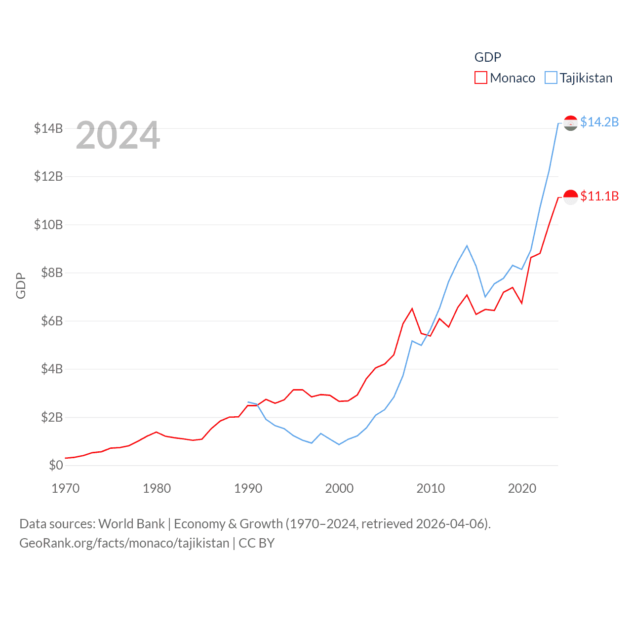 By GDP, Monaco ranks 152/197 ($11.1B) and Tajikistan ranks 145/197 ($14.2B). By GDP per capita, Monaco ranks 1/197 ($288,001), while Tajikistan ranks 166/197 ($1,341).