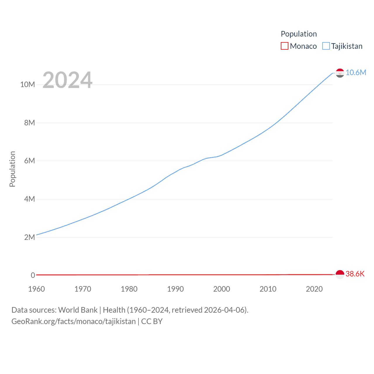 Monaco has a population of 38.6K (ranked 191/197), compared with 10.6M in Tajikistan (ranked 91/197). Monaco's land area is 0.8 sq mi versus 53,587 sq mi for Tajikistan (ranked 196th vs. 93rd).