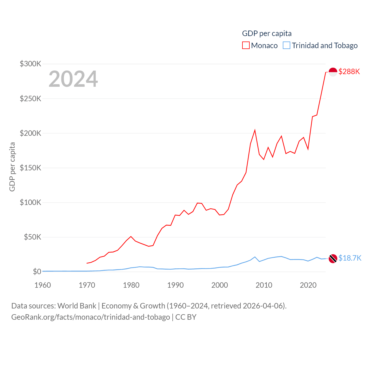 By GDP, Monaco ranks 152/197 ($11.1B) and Trinidad and Tobago ranks 115/197 ($25.6B). By GDP per capita, Monaco ranks 1/197 ($288,001), while Trinidad and Tobago ranks 61/197 ($18,733).