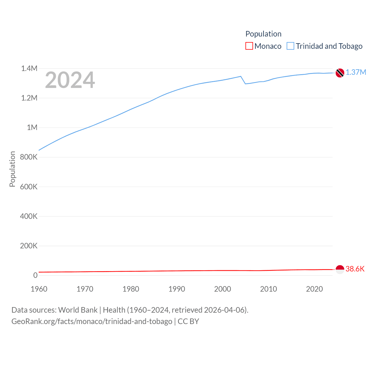 Monaco has a population of 38.6K (ranked 191/197), compared with 1.37M in Trinidad and Tobago (ranked 154/197). Monaco's land area is 0.8 sq mi versus 1,981 sq mi for Trinidad and Tobago (ranked 196th vs. 166th).