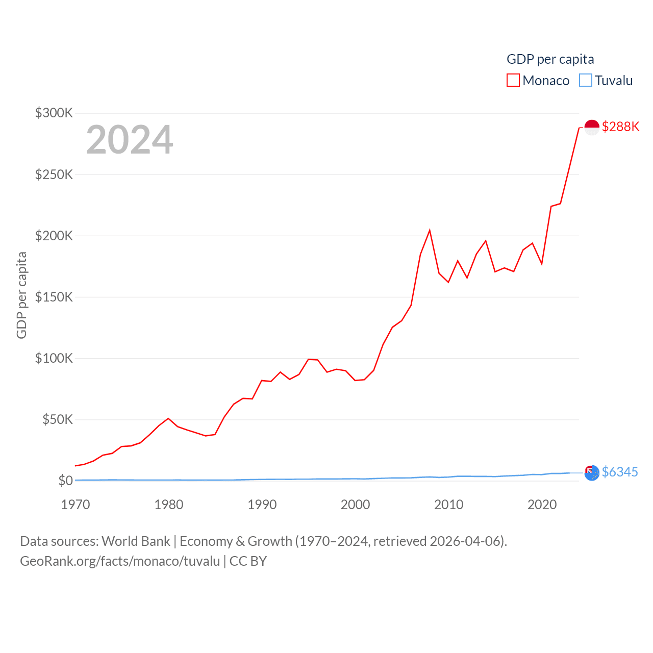 By GDP, Monaco ranks 152/197 ($11.1B) and Tuvalu ranks 196/197 ($62.3M). By GDP per capita, Monaco ranks 1/197 ($288,001), while Tuvalu ranks 110/197 ($6,345).