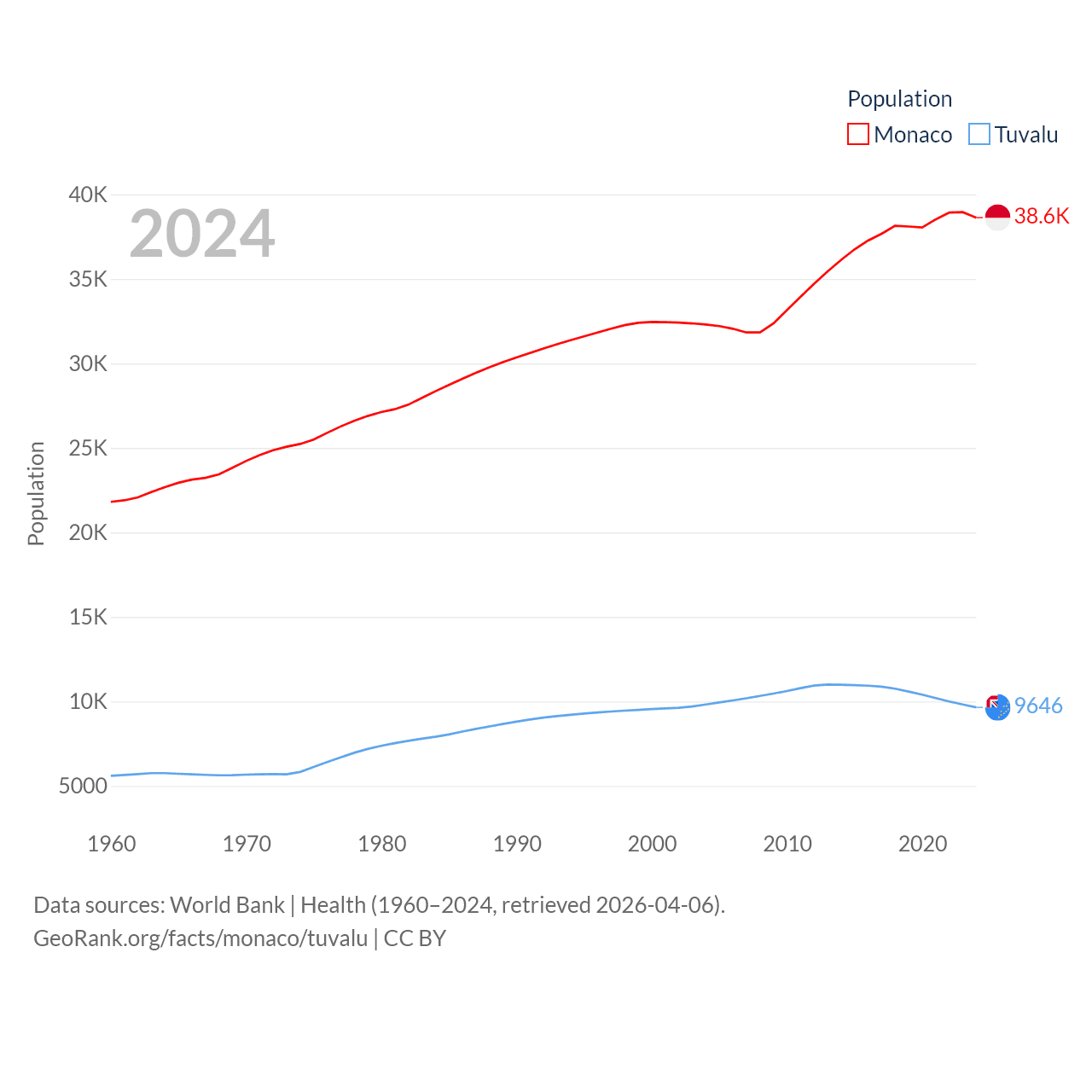 Monaco has a population of 38.6K (ranked 191/197), compared with 9.65K in Tuvalu (ranked 196/197). Monaco's land area is 0.8 sq mi versus 11.6 sq mi for Tuvalu (ranked 196th vs. 194th).