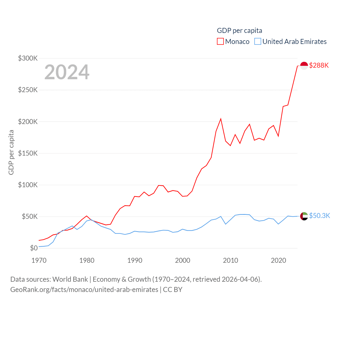 By GDP, Monaco ranks 152/197 ($11.1B) and The United Arab Emirates ranks 27/197 ($552B). By GDP per capita, Monaco ranks 1/197 ($288,001), while The United Arab Emirates ranks 24/197 ($50,274).