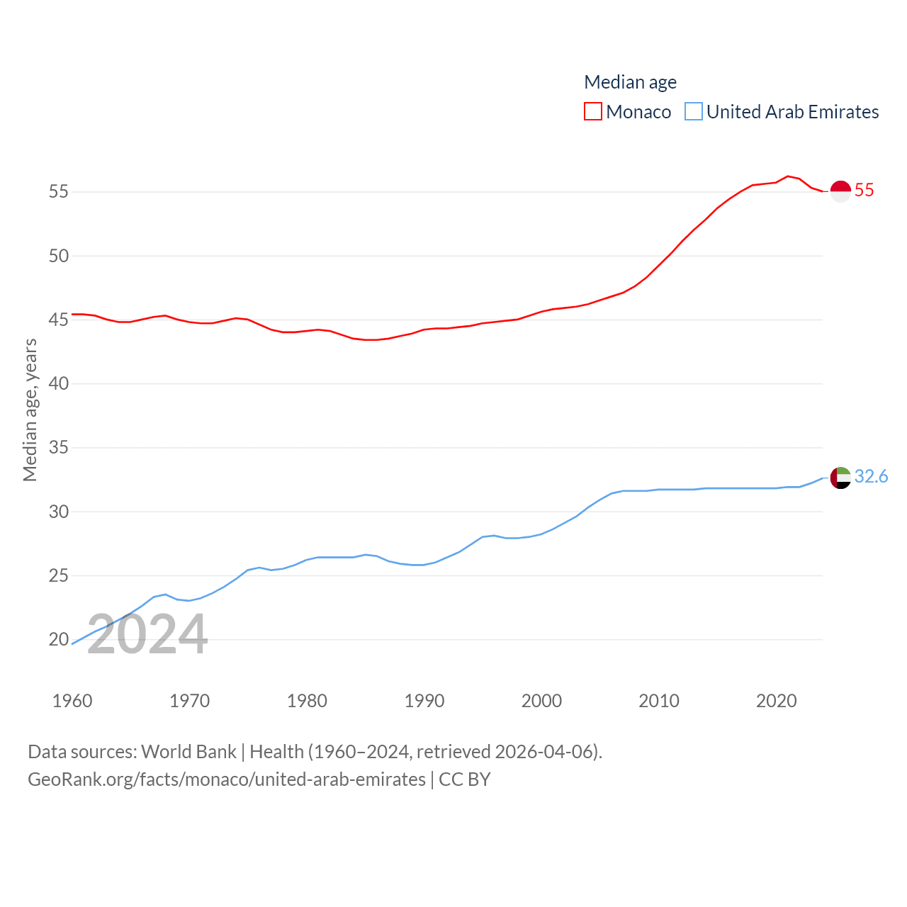 Monaco has a population of 38.6K (ranked 191/197), compared with 11M in The United Arab Emirates (ranked 86/197). Monaco's land area is 0.8 sq mi versus 27,421 sq mi for The United Arab Emirates (ranked 196th vs. 117th).