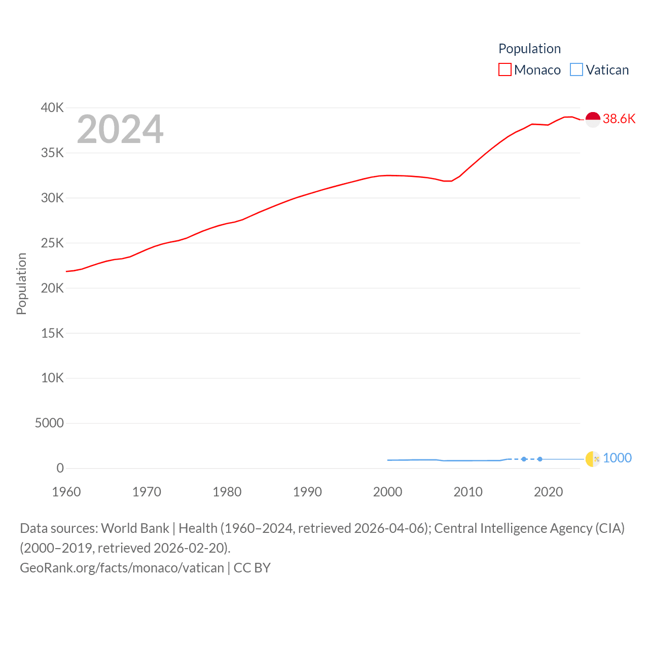 Monaco has a population of 38.6K (ranked 191/197), compared with 1K in The Vatican (ranked 197/197). Monaco's land area is 0.8 sq mi versus 0.17 sq mi for The Vatican (ranked 196th vs. 197th).