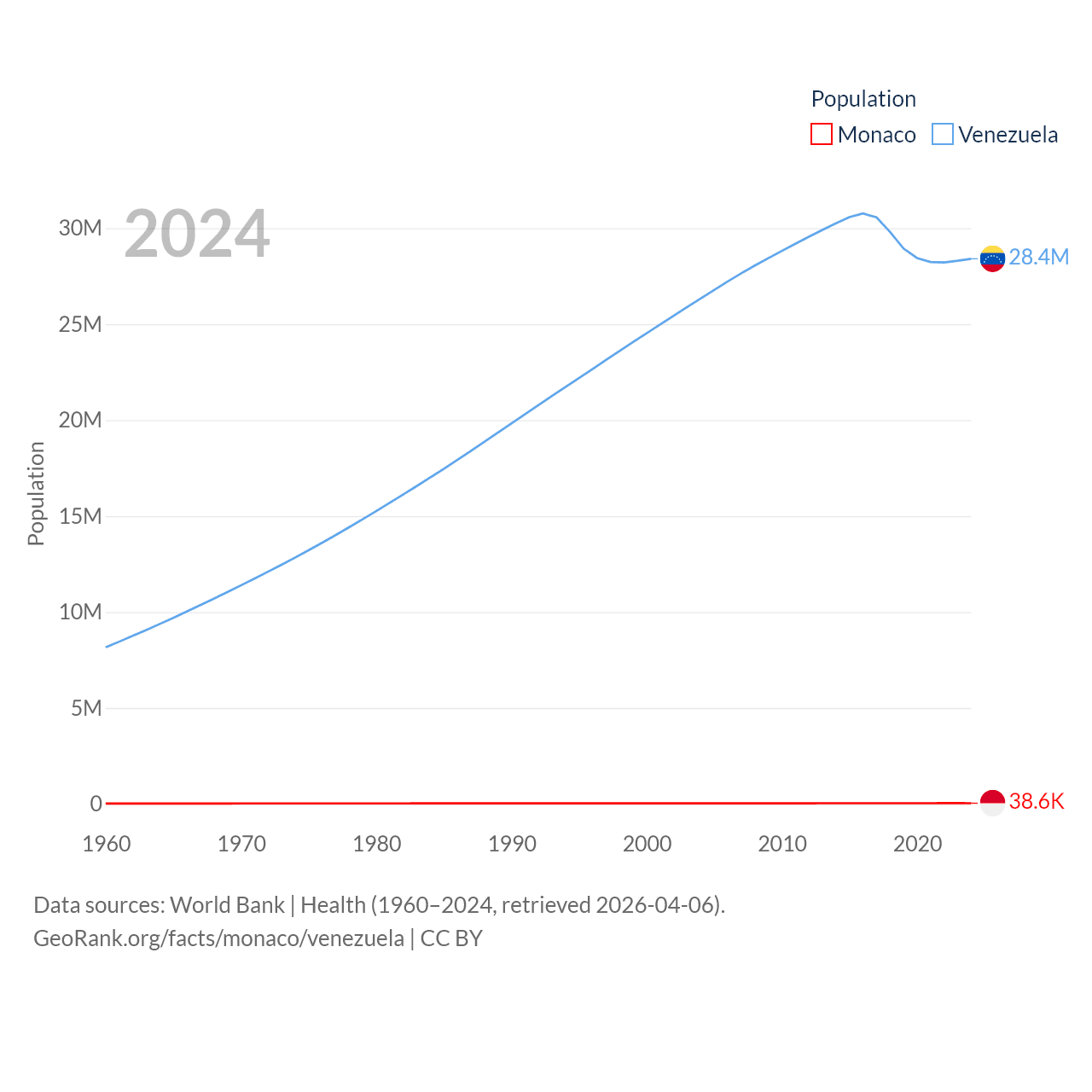 Monaco has a population of 38.6K (ranked 191/197), compared with 28.4M in Venezuela (ranked 53/197). Monaco's land area is 0.8 sq mi versus 340,561 sq mi for Venezuela (ranked 196th vs. 32nd).