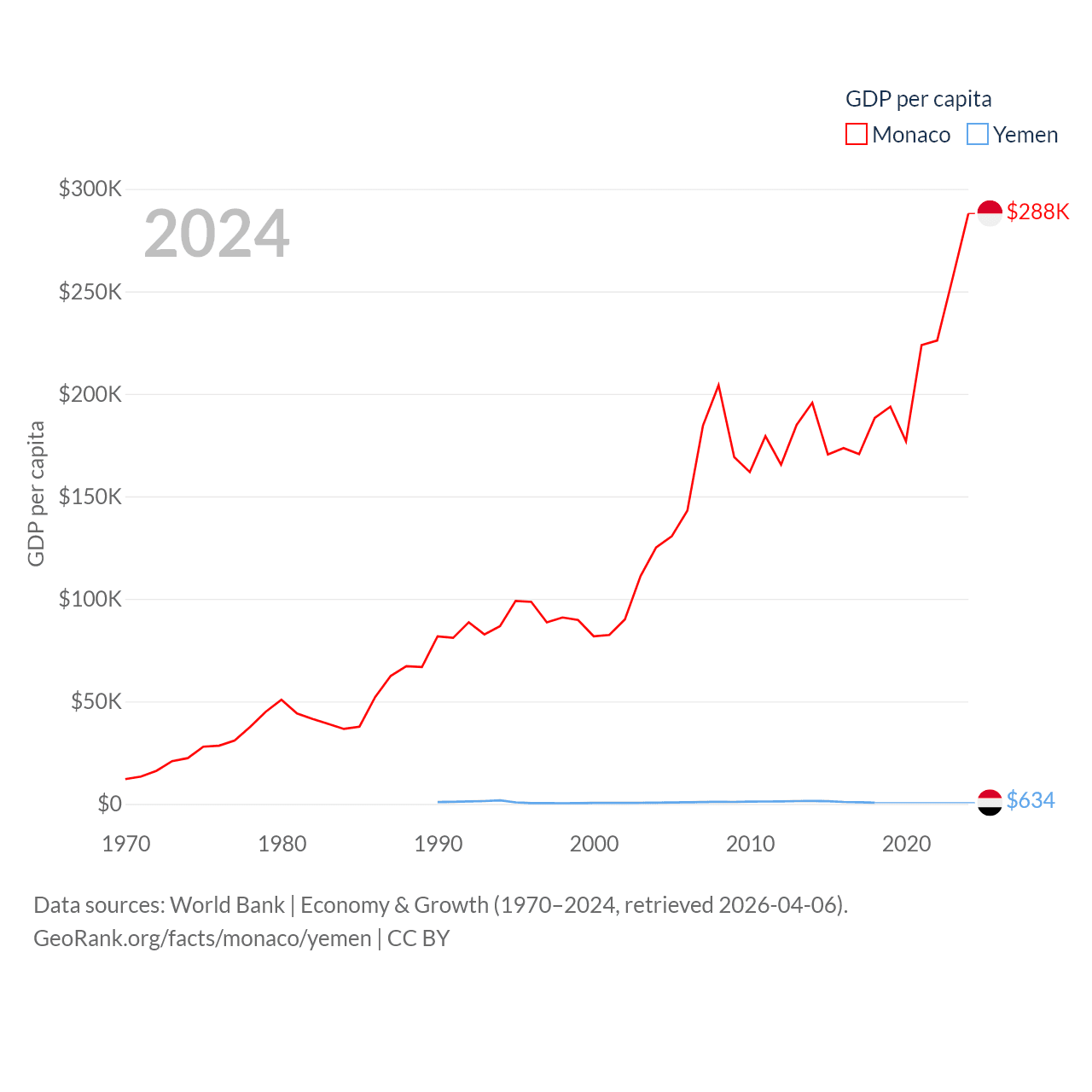 By GDP, Monaco ranks 152/197 ($11.1B) and Yemen ranks 125/197 ($21.6B). By GDP per capita, Monaco ranks 1/197 ($288,001), while Yemen ranks 191/197 ($634).