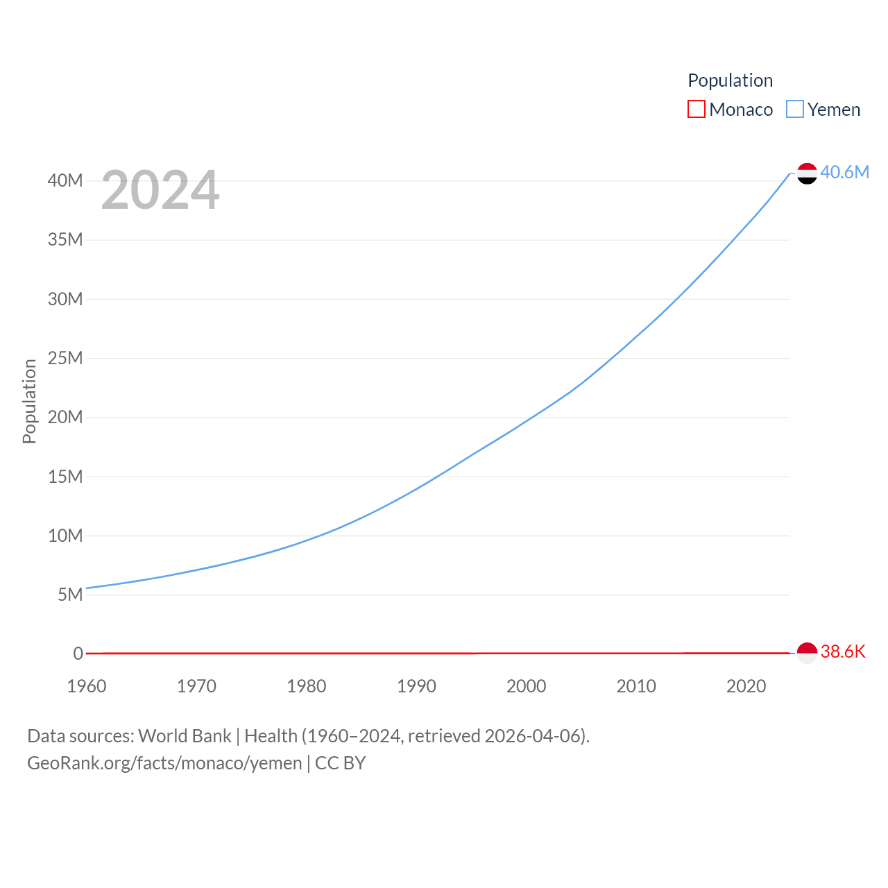 Monaco has a population of 38.6K (ranked 191/197), compared with 40.6M in Yemen (ranked 38/197). Monaco's land area is 0.8 sq mi versus 203,850 sq mi for Yemen (ranked 196th vs. 49th).