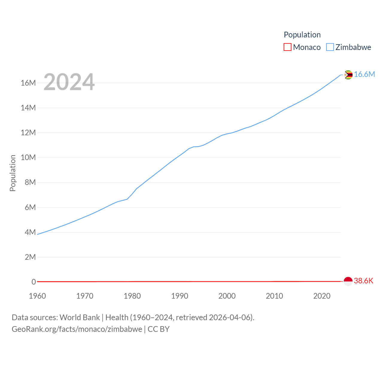 Monaco has a population of 38.6K (ranked 191/197), compared with 16.6M in Zimbabwe (ranked 74/197). Monaco's land area is 0.8 sq mi versus 149,364 sq mi for Zimbabwe (ranked 196th vs. 60th).