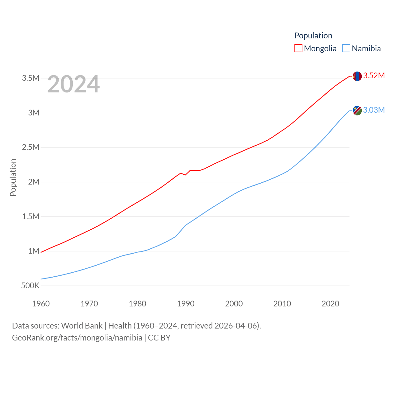 Mongolia has a population of 3.52M (ranked 132/197), compared with 3.03M in Namibia (ranked 136/197). Mongolia's land area is 601,740 sq mi versus 317,874 sq mi for Namibia (ranked 18th vs. 33rd).