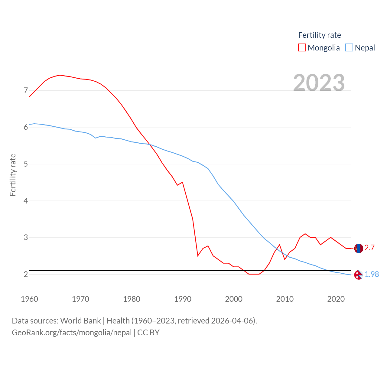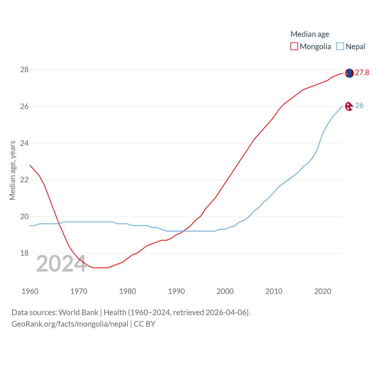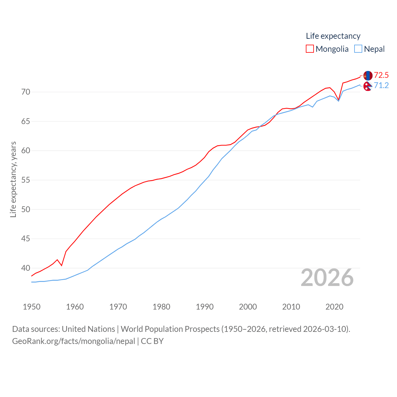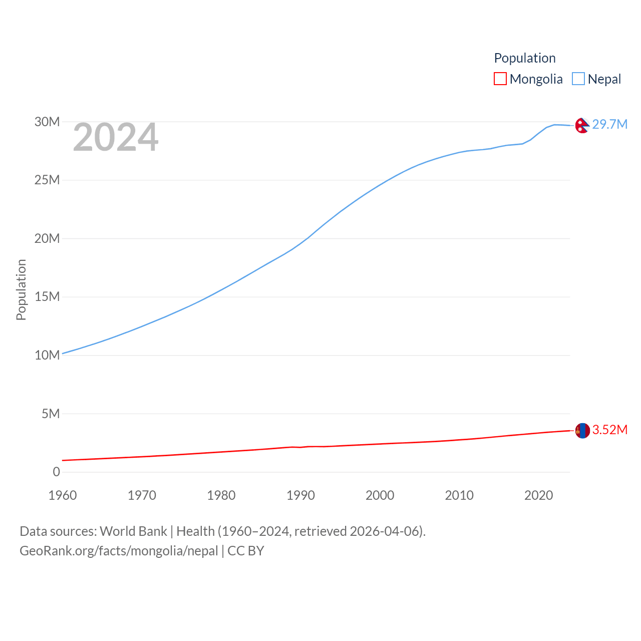 Mongolia has a population of 3.52M (ranked 132/197), compared with 29.7M in Nepal (ranked 51/197). Mongolia's land area is 601,740 sq mi versus 55,348 sq mi for Nepal (ranked 18th vs. 92nd).
