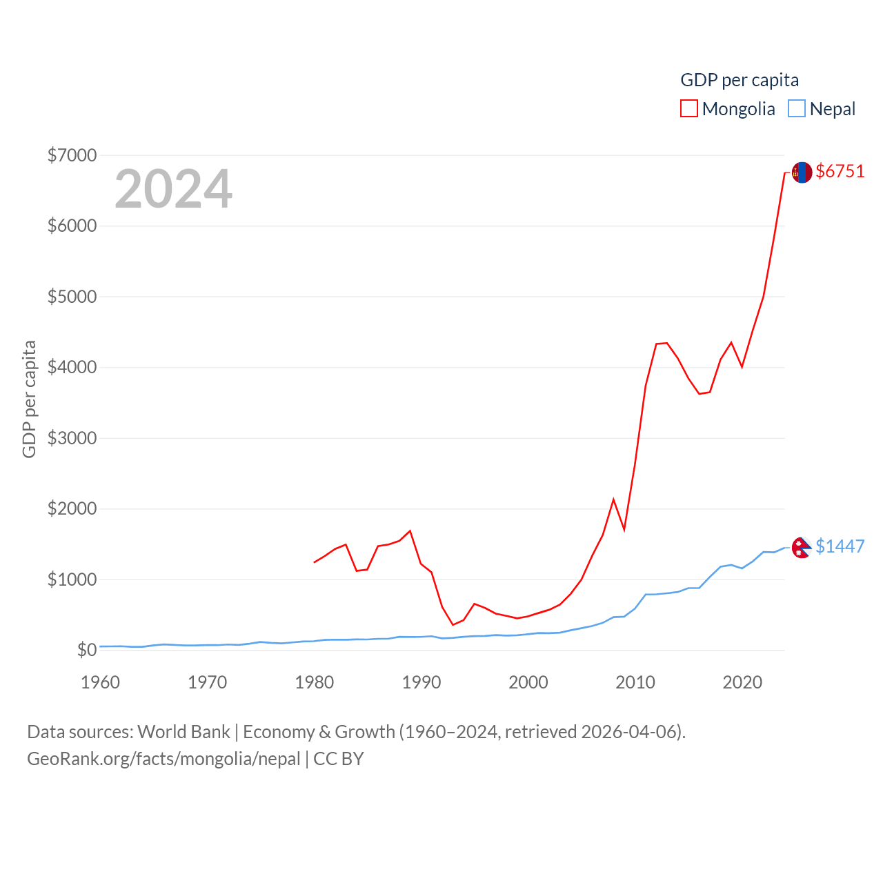 By GDP, Mongolia ranks 121/197 ($23.8B) and Nepal ranks 101/197 ($42.9B). By GDP per capita, Mongolia ranks 105/197 ($6,751), while Nepal ranks 164/197 ($1,447).