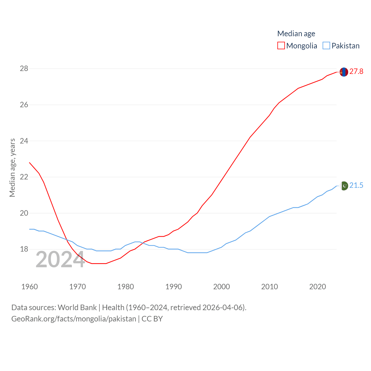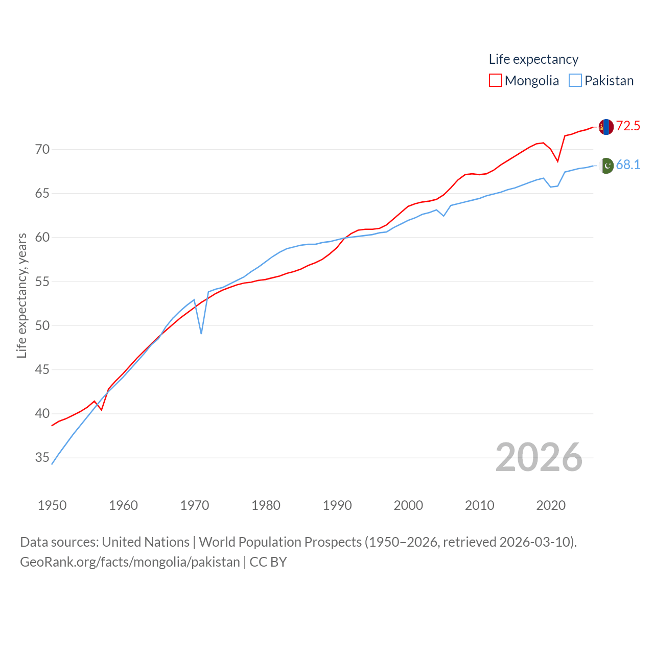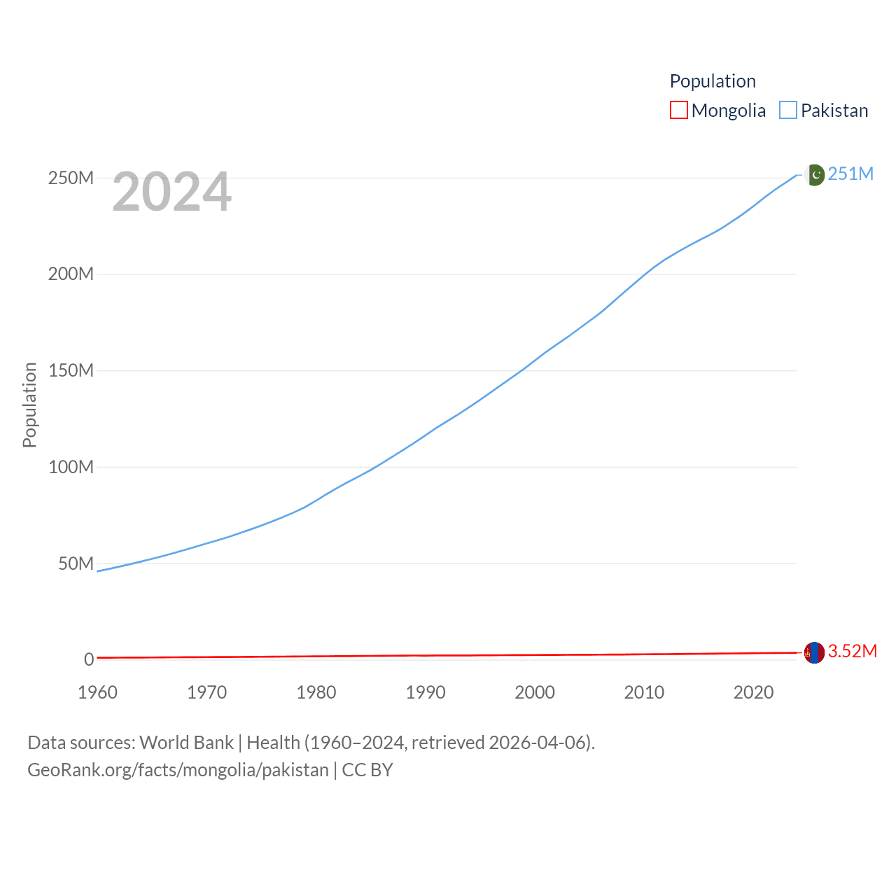 Mongolia has a population of 3.52M (ranked 132/197), compared with 251M in Pakistan (ranked 5/197). Mongolia's land area is 601,740 sq mi versus 297,638 sq mi for Pakistan (ranked 18th vs. 35th).