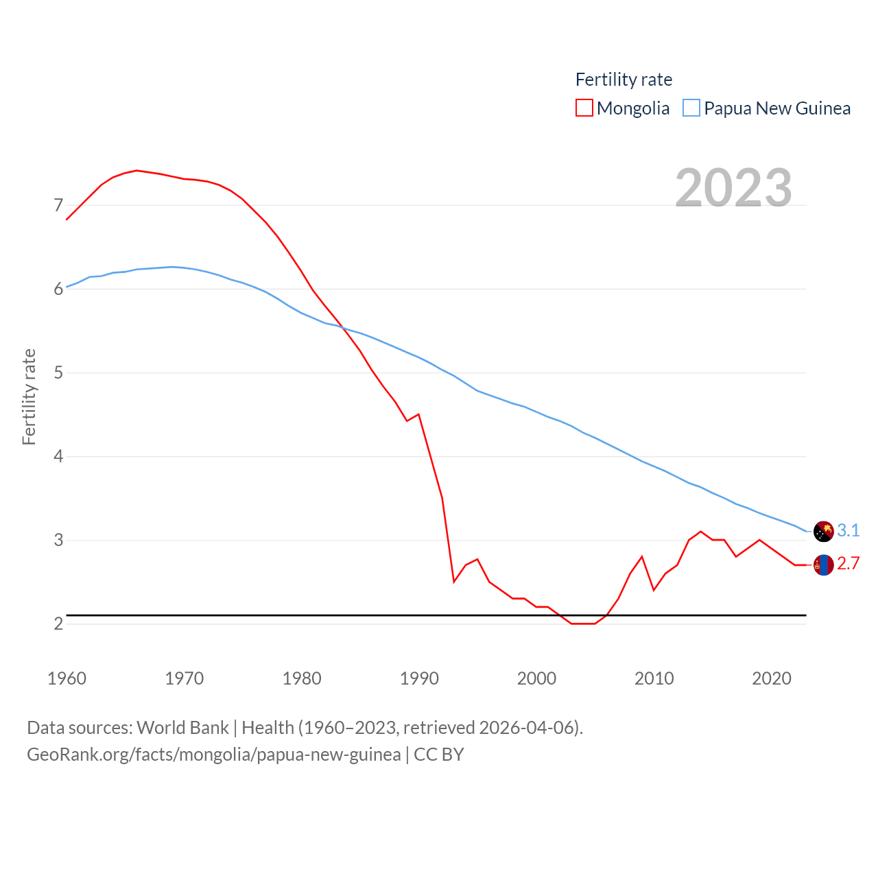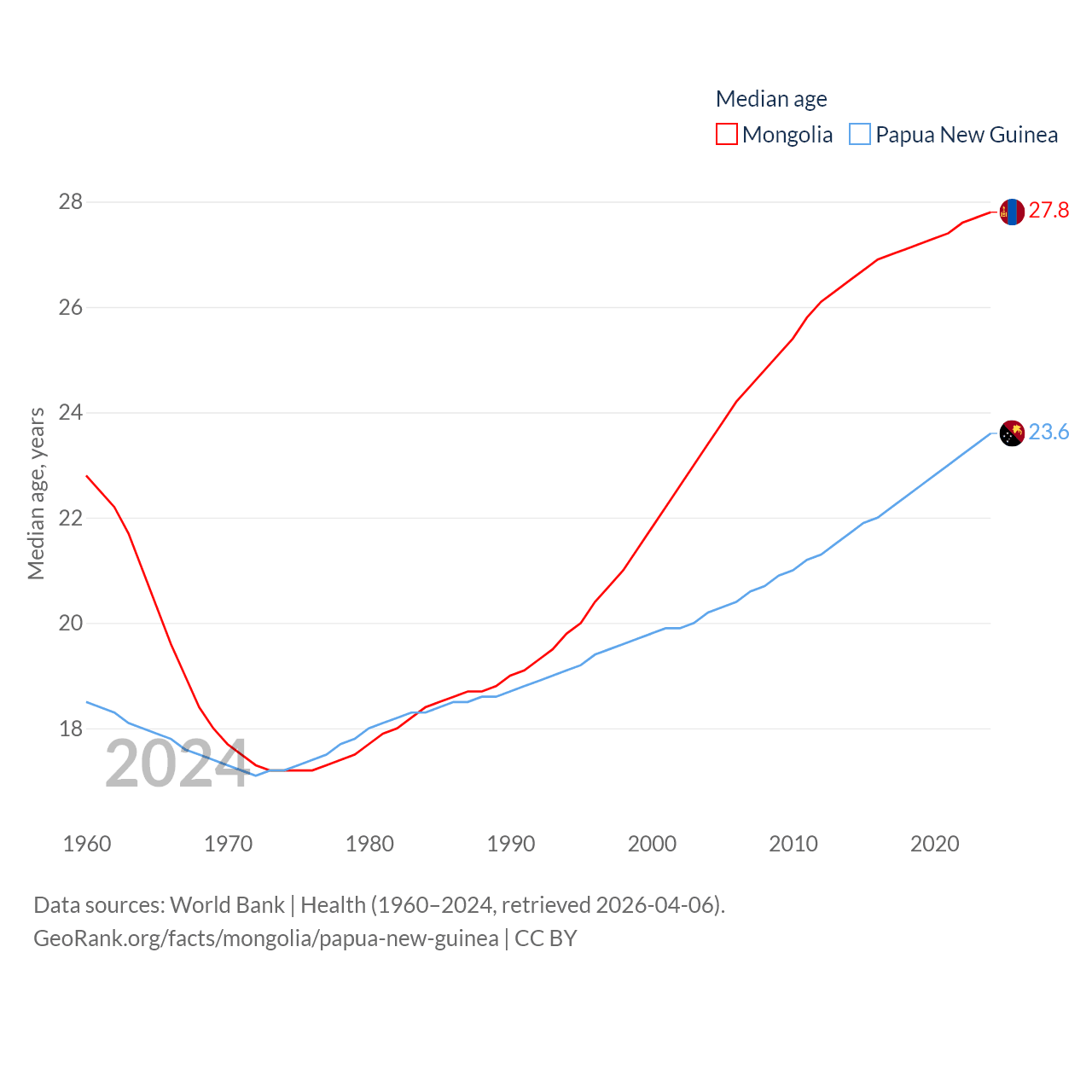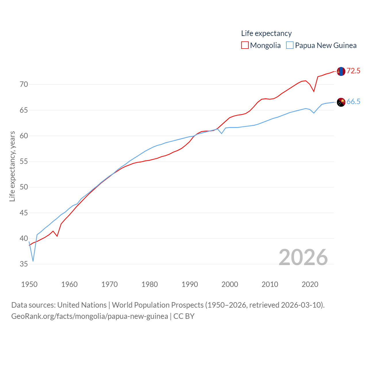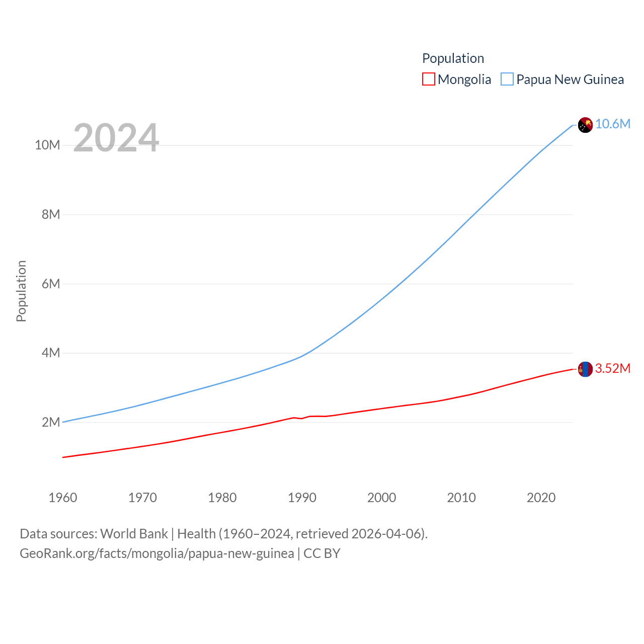 Mongolia has a population of 3.52M (ranked 132/197), compared with 10.6M in Papua New Guinea (ranked 92/197). Mongolia's land area is 601,740 sq mi versus 174,850 sq mi for Papua New Guinea (ranked 18th vs. 54th).