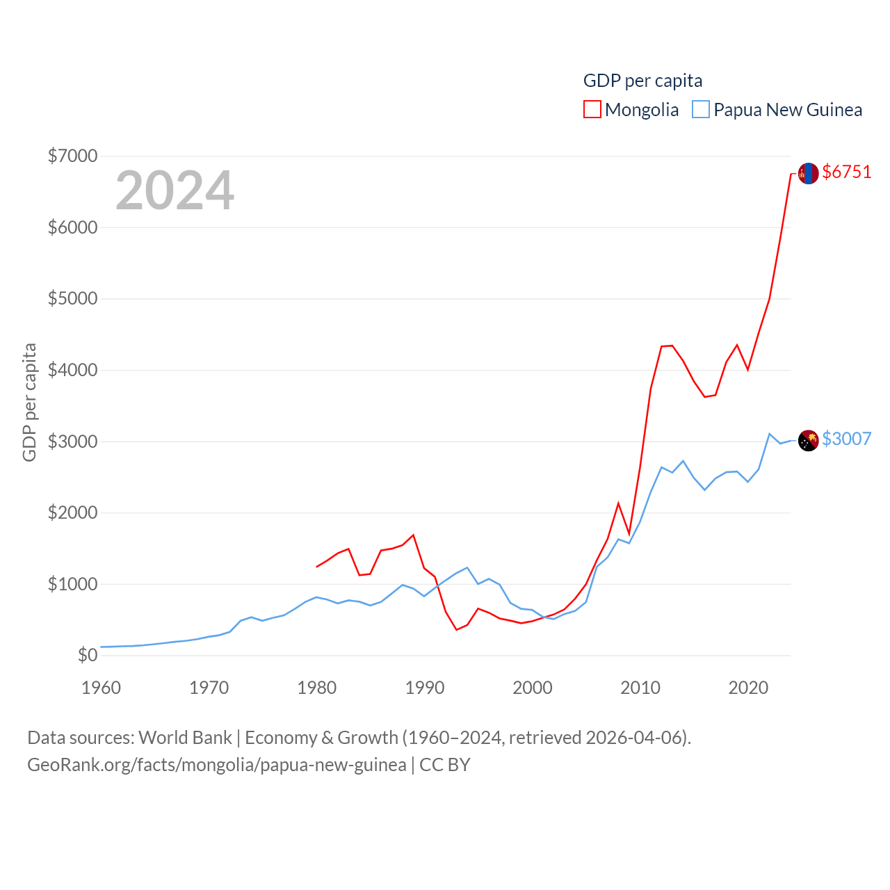 By GDP, Mongolia ranks 121/197 ($23.8B) and Papua New Guinea ranks 110/197 ($31.8B). By GDP per capita, Mongolia ranks 105/197 ($6,751), while Papua New Guinea ranks 140/197 ($3,007).