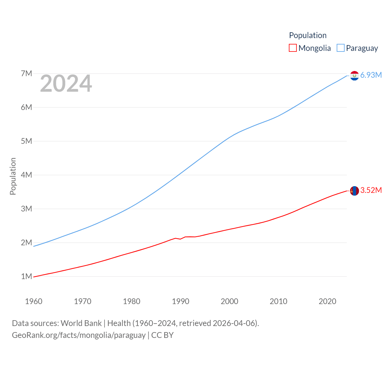 Mongolia has a population of 3.52M (ranked 132/197), compared with 6.93M in Paraguay (ranked 107/197). Mongolia's land area is 601,740 sq mi versus 152,901 sq mi for Paraguay (ranked 18th vs. 59th).