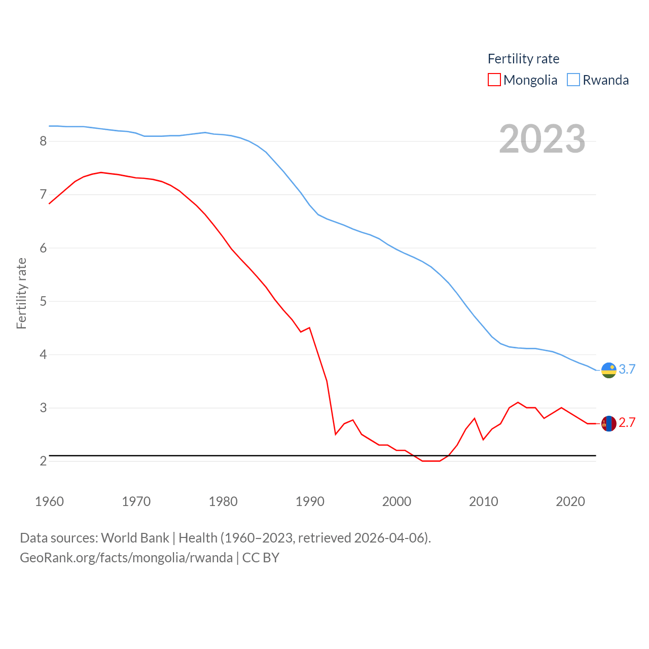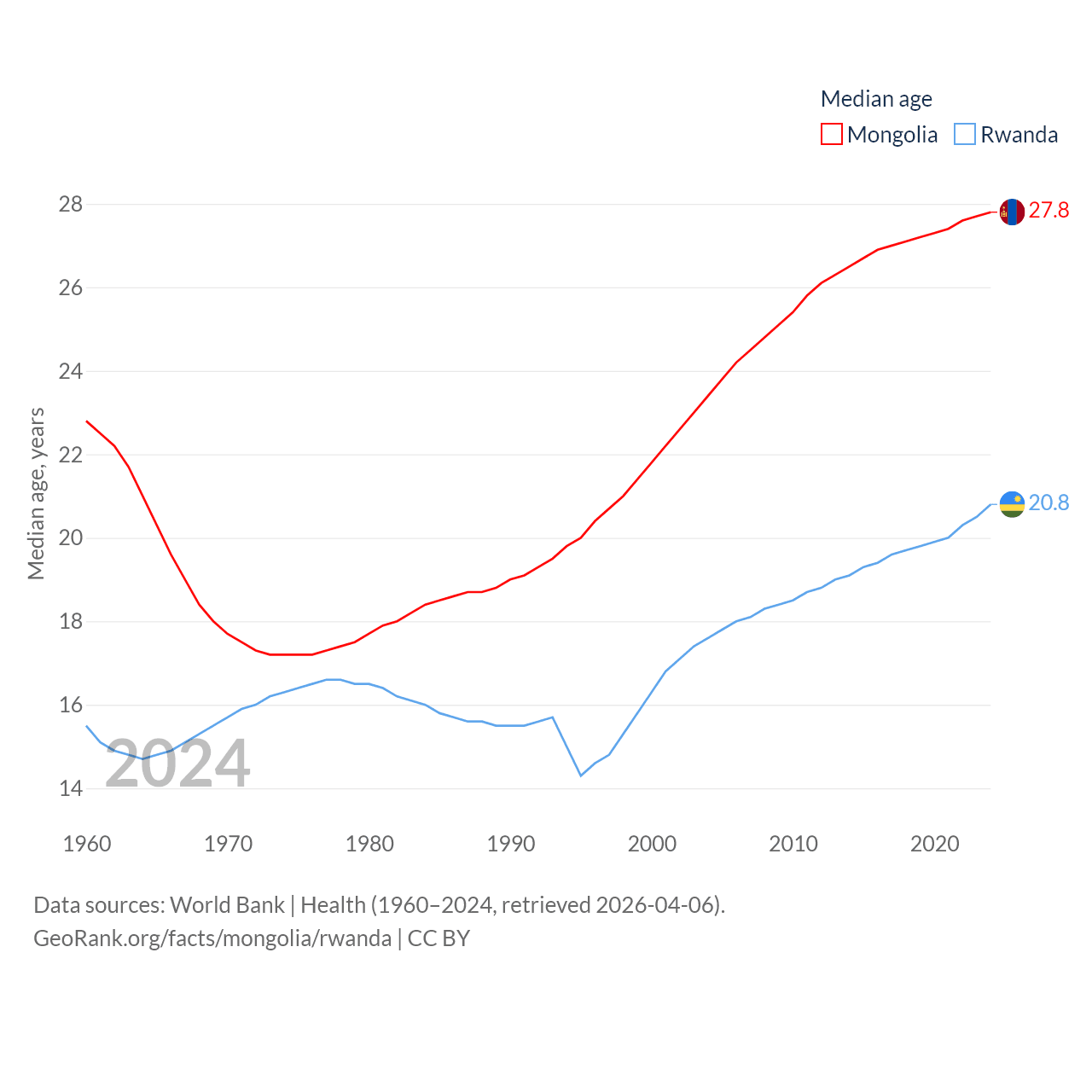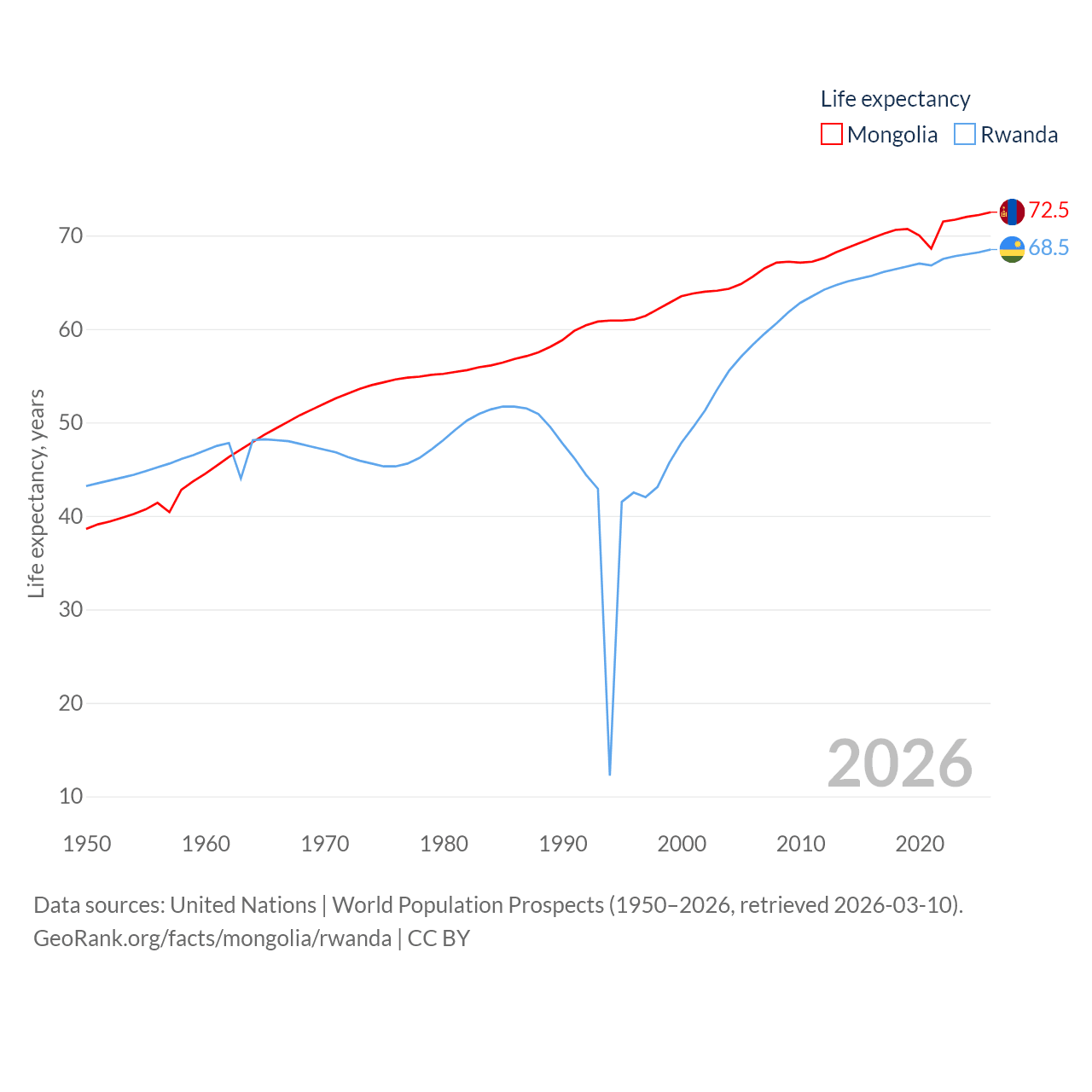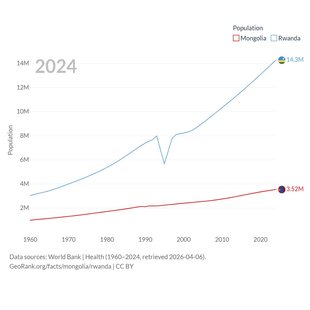 Mongolia has a population of 3.52M (ranked 132/197), compared with 14.3M in Rwanda (ranked 77/197). Mongolia's land area is 601,740 sq mi versus 9,525 sq mi for Rwanda (ranked 18th vs. 146th).