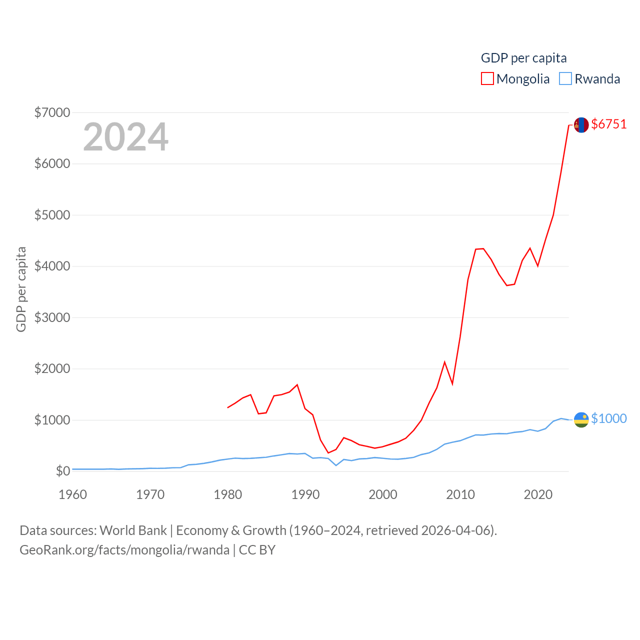 By GDP, Mongolia ranks 121/197 ($23.8B) and Rwanda ranks 144/197 ($14.3B). By GDP per capita, Mongolia ranks 105/197 ($6,751), while Rwanda ranks 178/197 ($1,000).