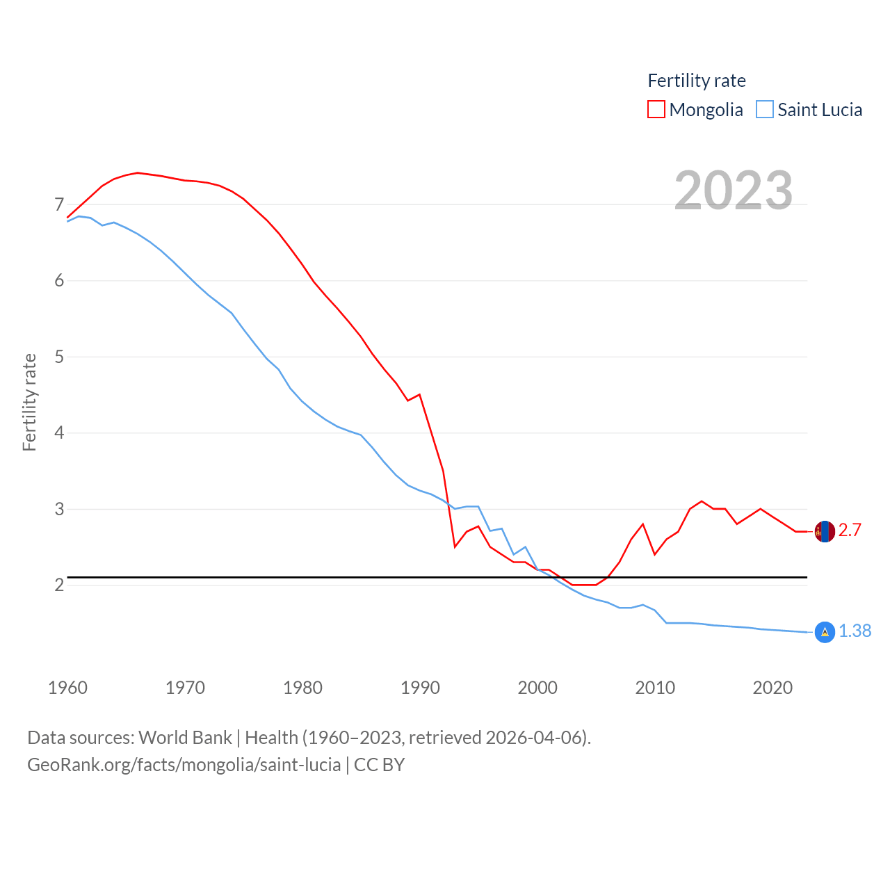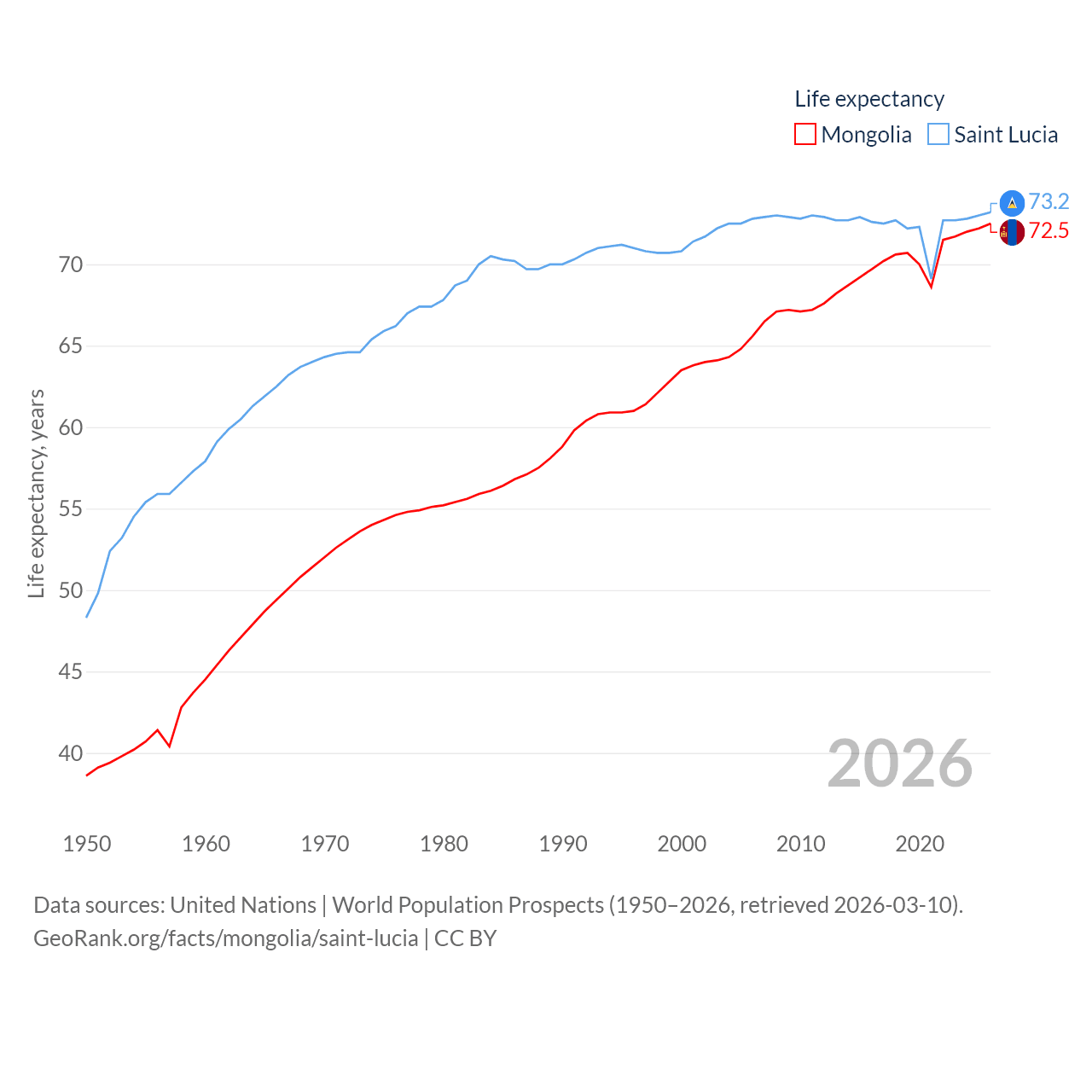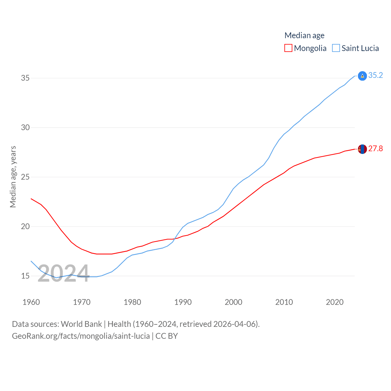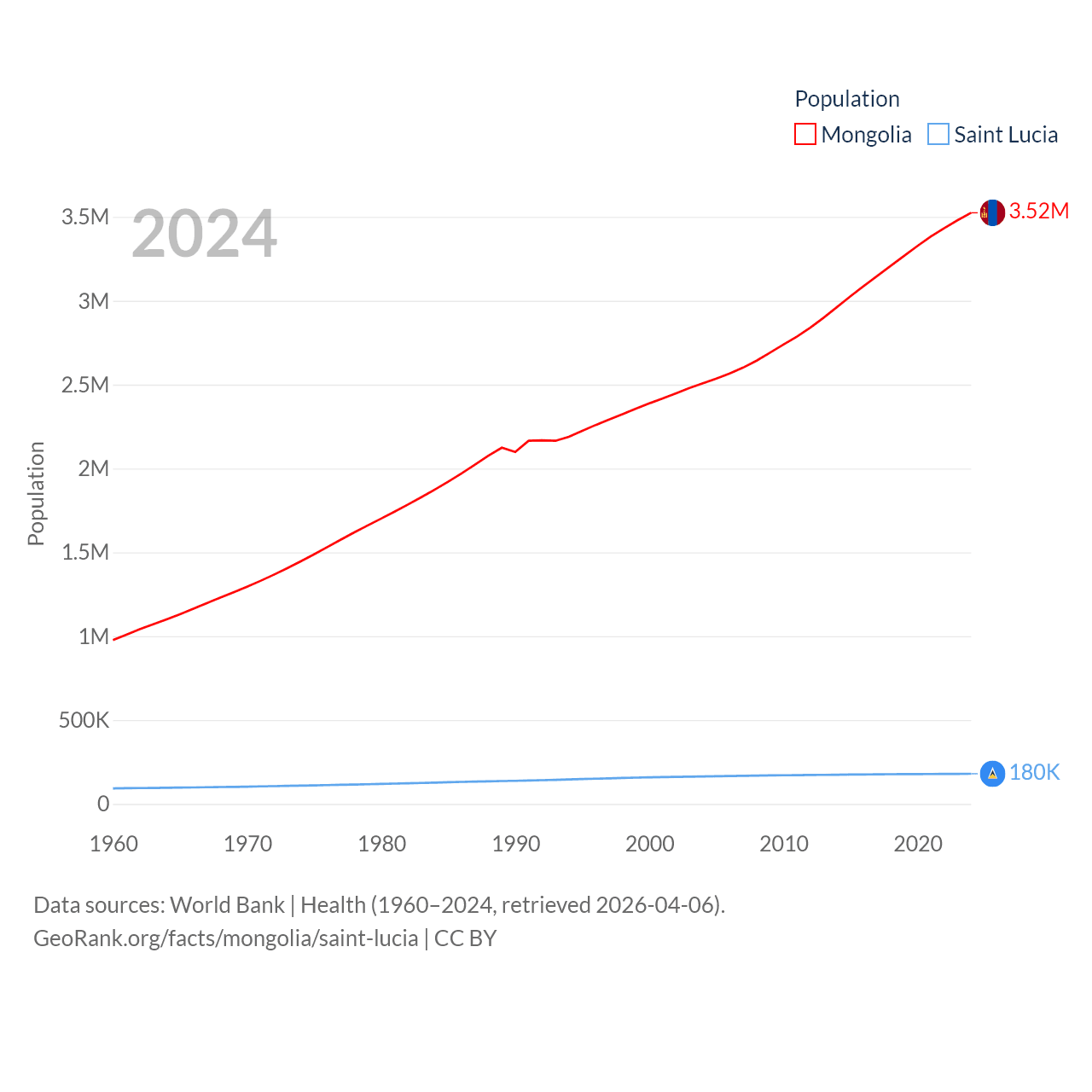 Mongolia has a population of 3.52M (ranked 132/197), compared with 180K in Saint Lucia (ranked 178/197). Mongolia's land area is 601,740 sq mi versus 235.5 sq mi for Saint Lucia (ranked 18th vs. 178th).