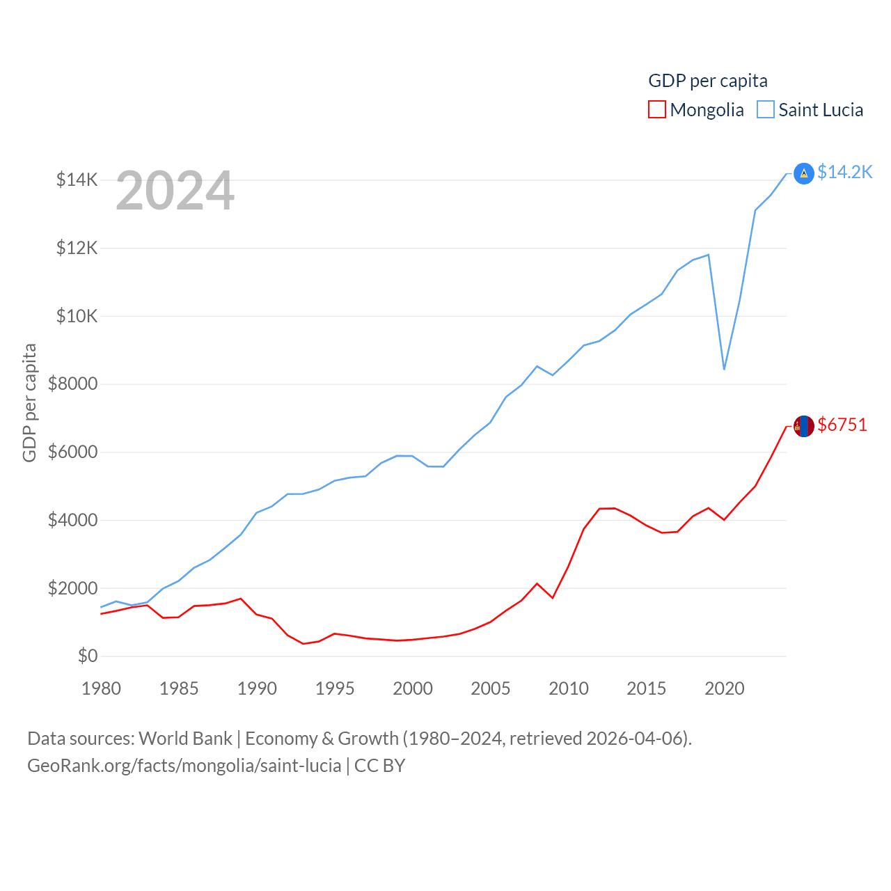 By GDP, Mongolia ranks 121/197 ($23.8B) and Saint Lucia ranks 173/197 ($2.55B). By GDP per capita, Mongolia ranks 105/197 ($6,751), while Saint Lucia ranks 70/197 ($14,182).