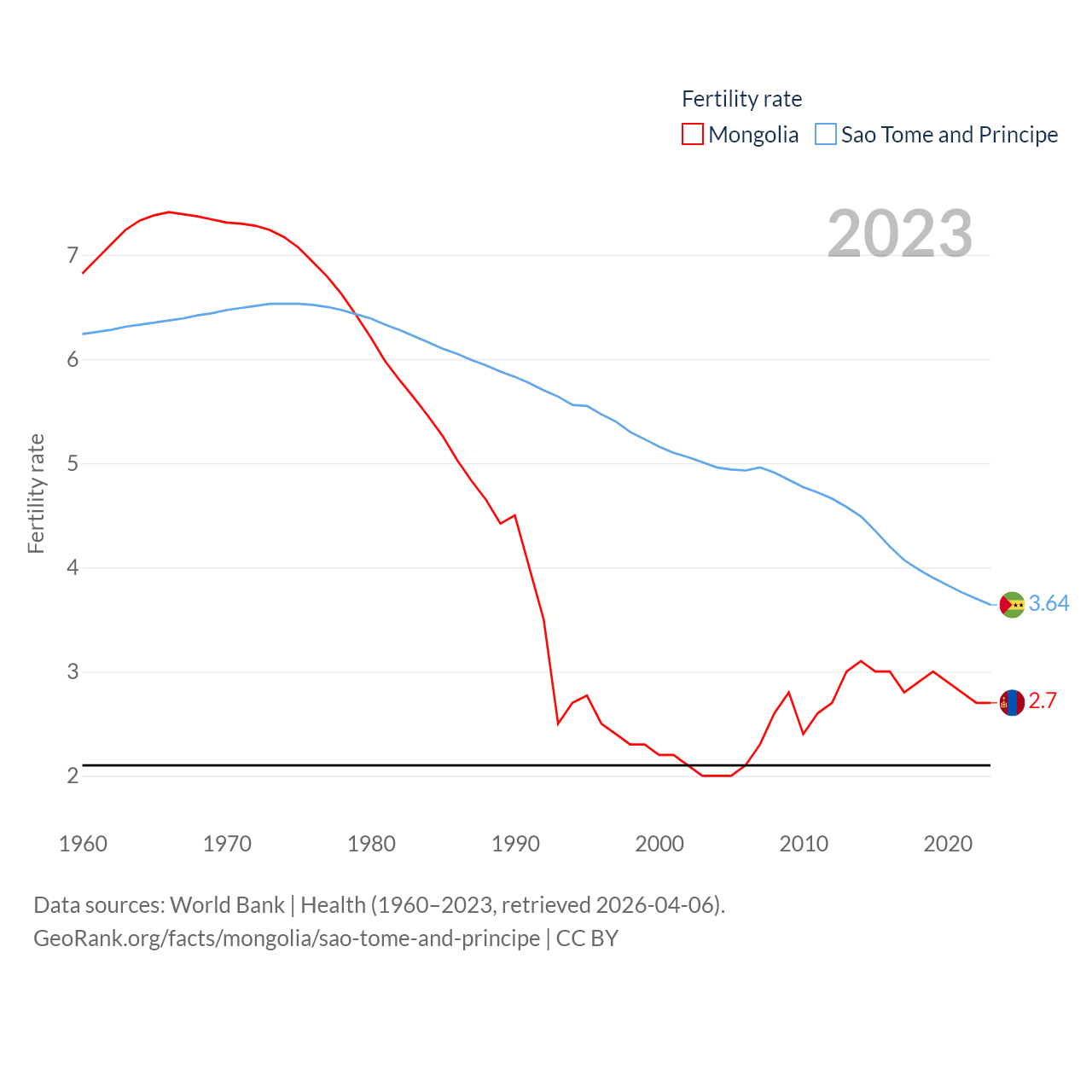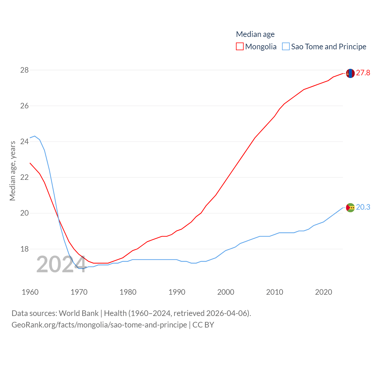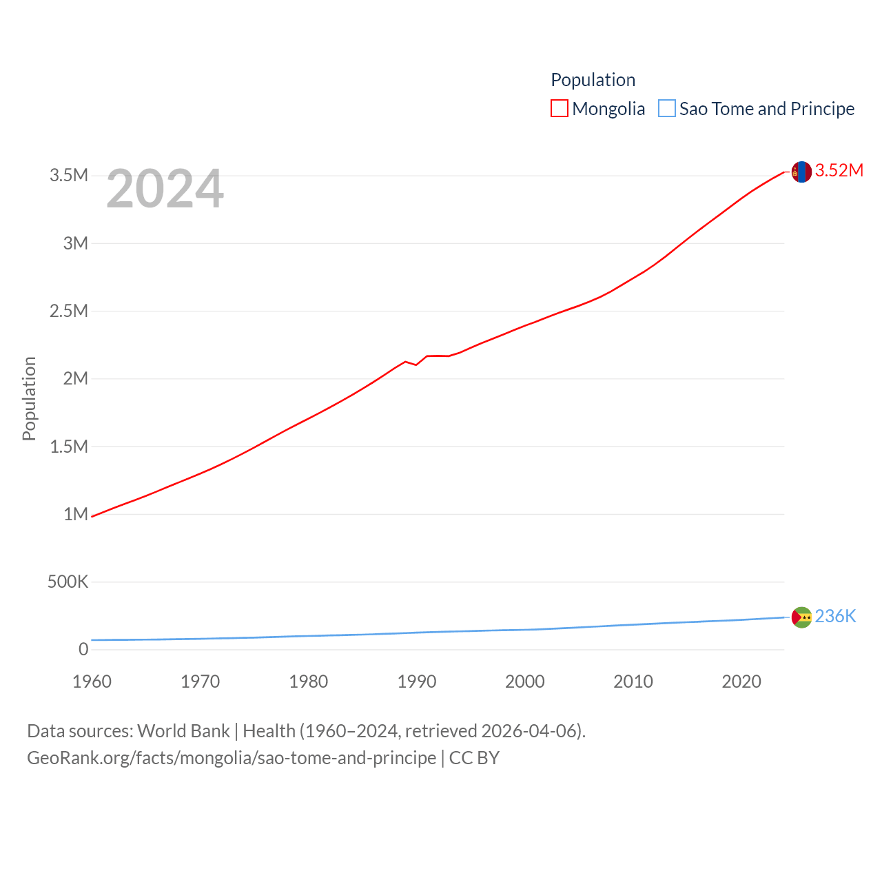Mongolia has a population of 3.52M (ranked 132/197), compared with 236K in Sao Tome and Principe (ranked 176/197). Mongolia's land area is 601,740 sq mi versus 371 sq mi for Sao Tome and Principe (ranked 18th vs. 172nd).