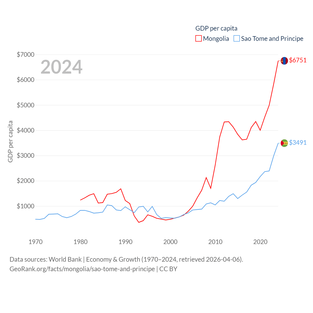 By GDP, Mongolia ranks 121/197 ($23.8B) and Sao Tome and Principe ranks 189/197 ($822M). By GDP per capita, Mongolia ranks 105/197 ($6,751), while Sao Tome and Principe ranks 134/197 ($3,491).