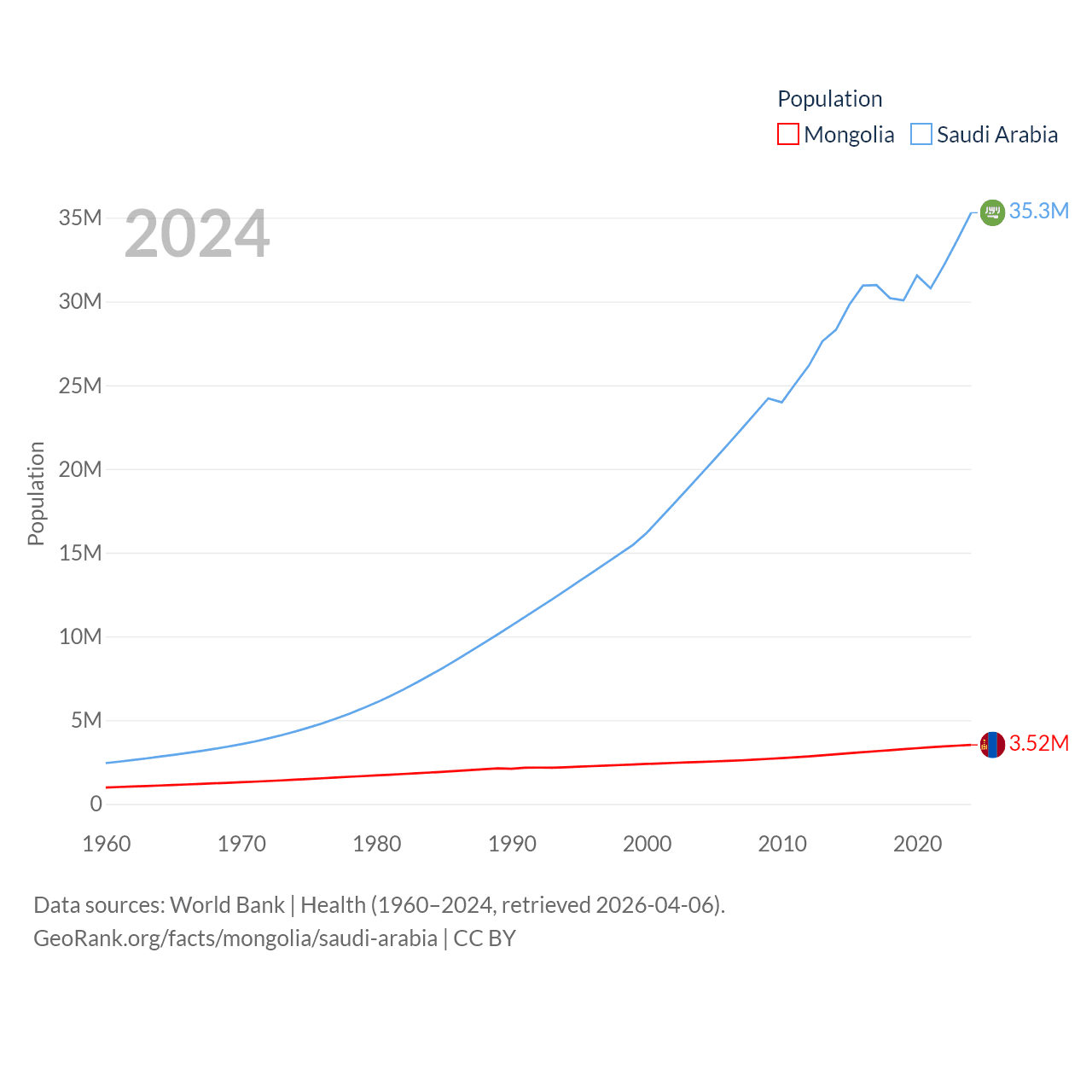 Mongolia has a population of 3.52M (ranked 132/197), compared with 35.3M in Saudi Arabia (ranked 45/197). Mongolia's land area is 601,740 sq mi versus 830,000 sq mi for Saudi Arabia (ranked 18th vs. 12th).