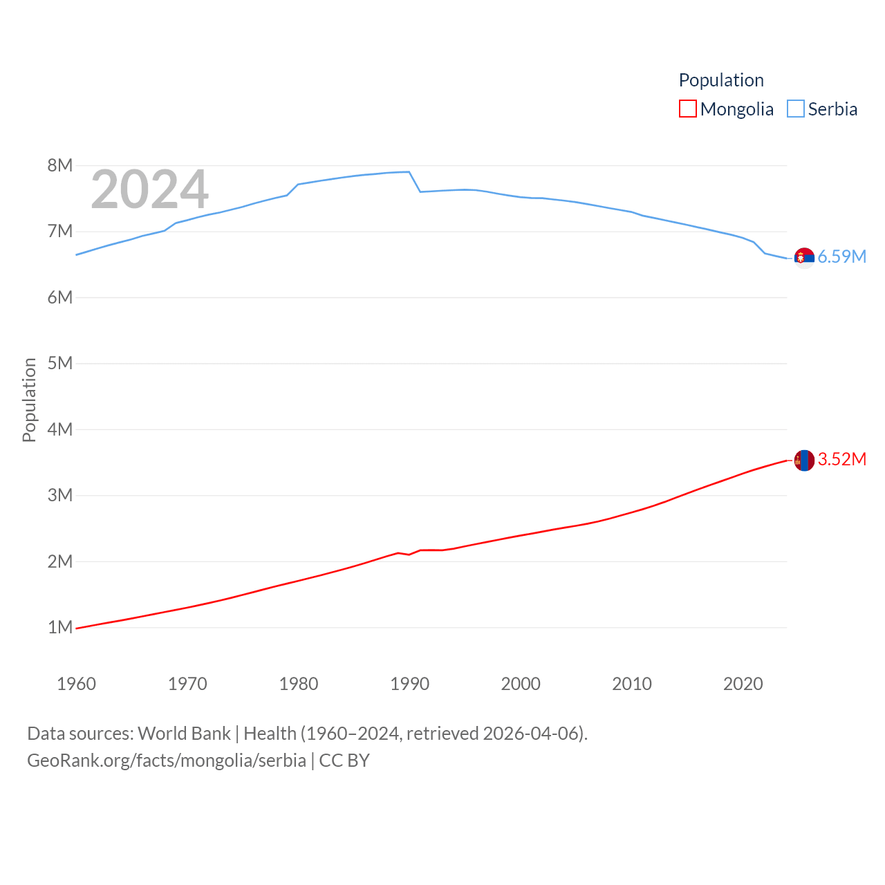 Mongolia has a population of 3.52M (ranked 132/197), compared with 6.59M in Serbia (ranked 109/197). Mongolia's land area is 601,740 sq mi versus 32,467 sq mi for Serbia (ranked 18th vs. 111th).