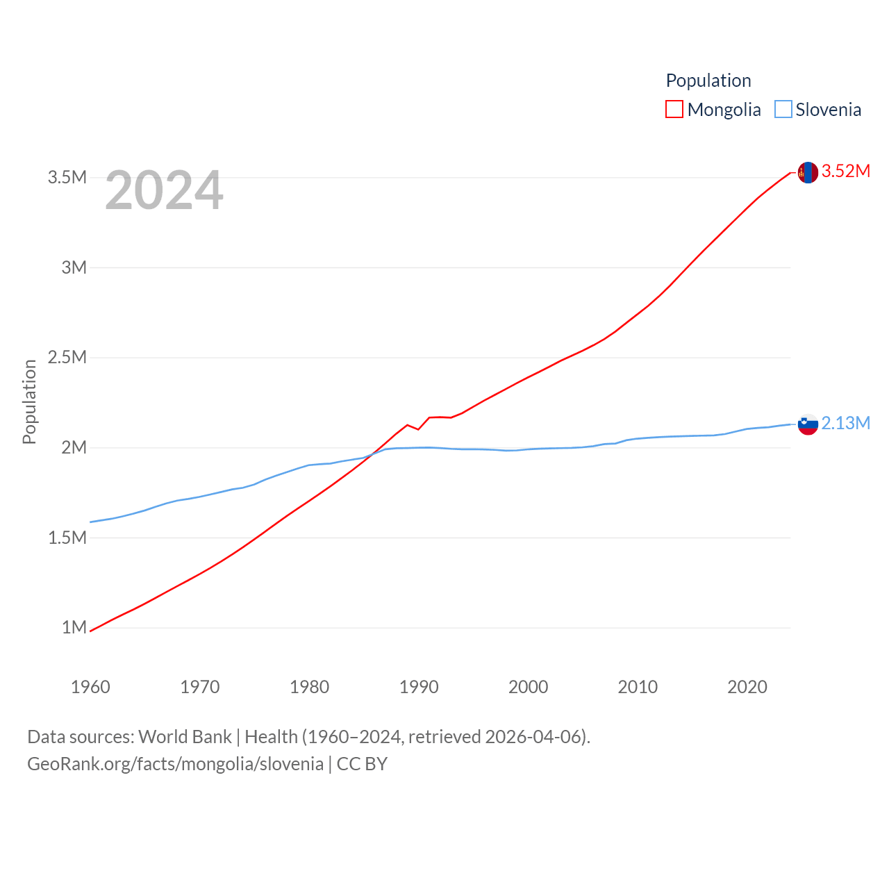 Mongolia has a population of 3.52M (ranked 132/197), compared with 2.13M in Slovenia (ranked 147/197). Mongolia's land area is 601,740 sq mi versus 7,774 sq mi for Slovenia (ranked 18th vs. 151st).