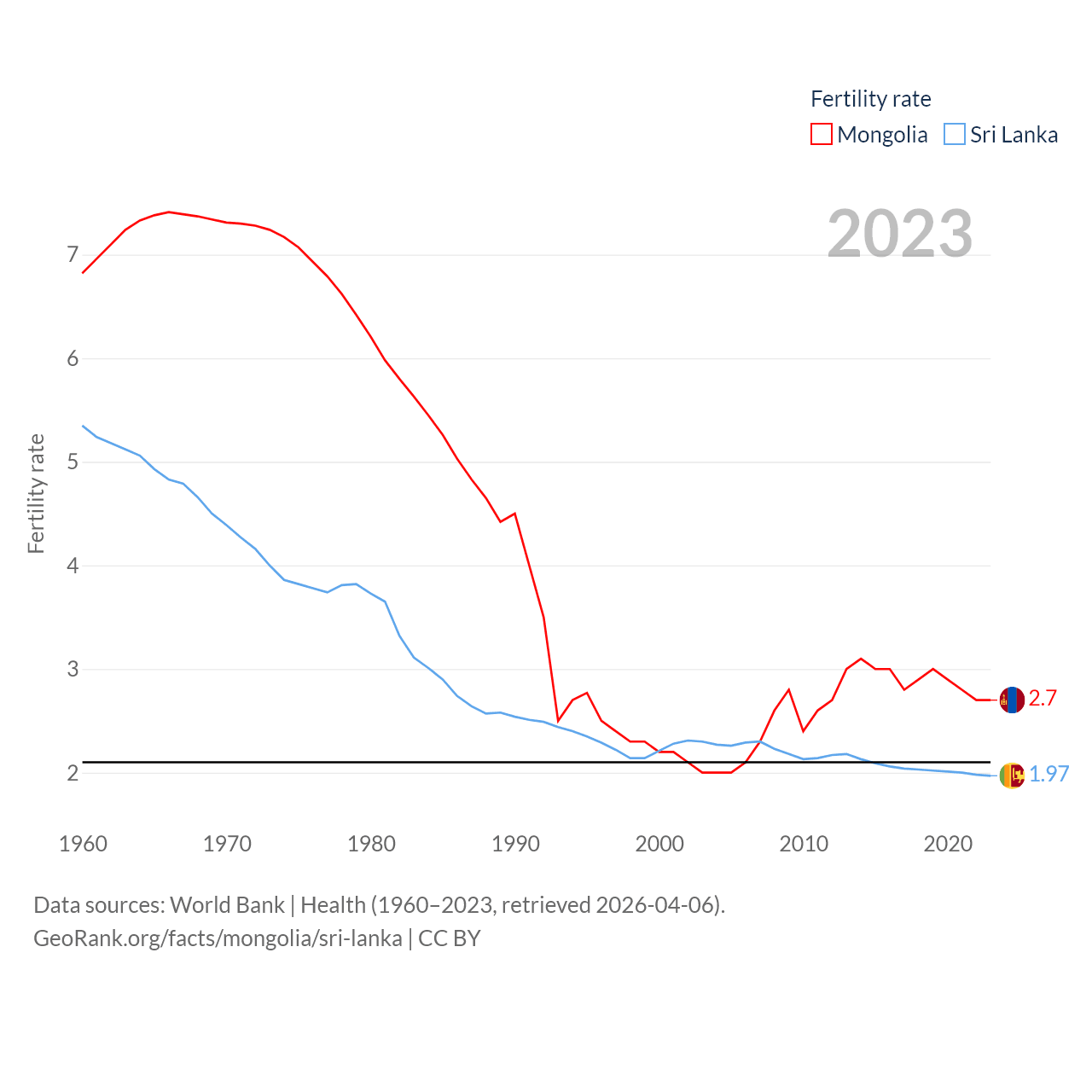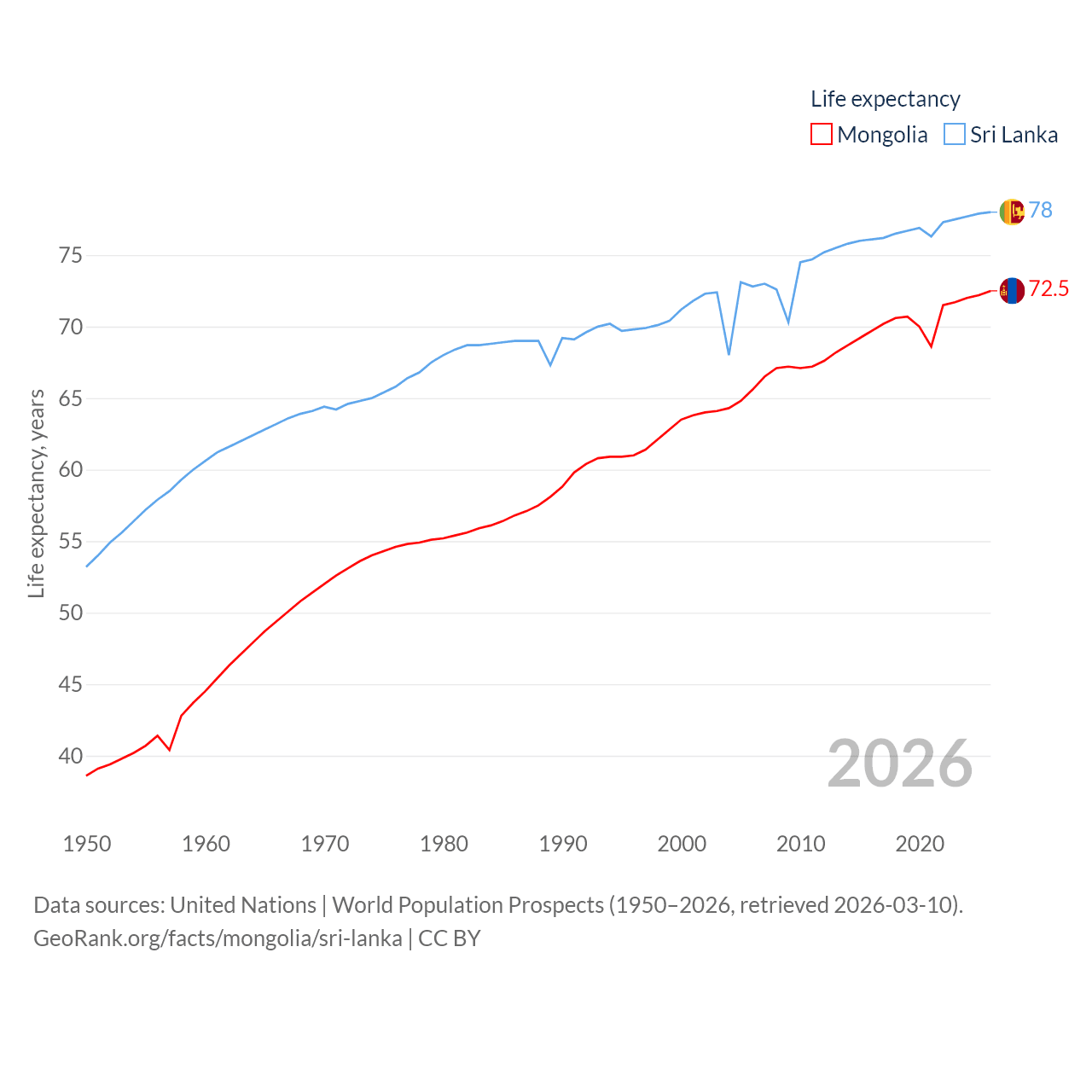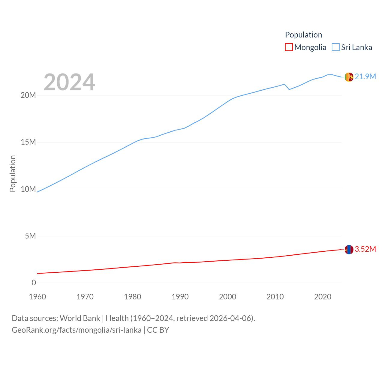 Mongolia has a population of 3.52M (ranked 132/197), compared with 21.9M in Sri Lanka (ranked 61/197). Mongolia's land area is 601,740 sq mi versus 23,884 sq mi for Sri Lanka (ranked 18th vs. 122nd).