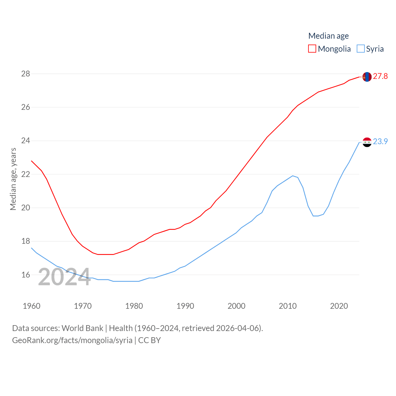 Mongolia has a population of 3.52M (ranked 132/197), compared with 24.7M in Syria (ranked 57/197). Mongolia's land area is 601,740 sq mi versus 70,900 sq mi for Syria (ranked 18th vs. 87th).