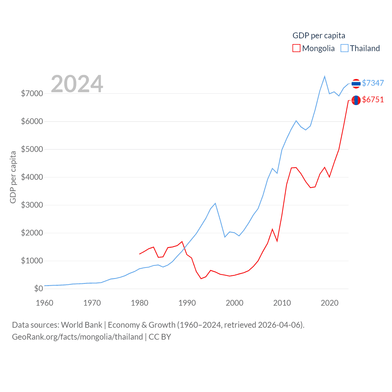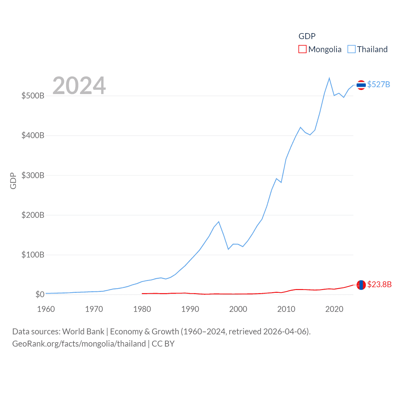 By GDP, Mongolia ranks 121/197 ($23.8B) and Thailand ranks 31/197 ($527B). By GDP per capita, Mongolia ranks 105/197 ($6,751), while Thailand ranks 100/197 ($7,347).