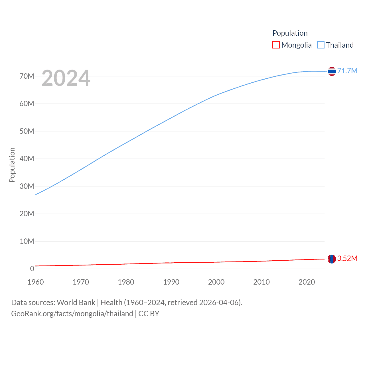Mongolia has a population of 3.52M (ranked 132/197), compared with 71.7M in Thailand (ranked 20/197). Mongolia's land area is 601,740 sq mi versus 197,256 sq mi for Thailand (ranked 18th vs. 50th).