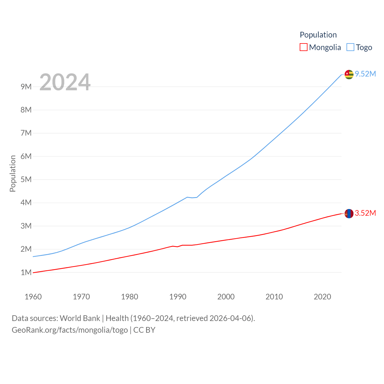 Mongolia has a population of 3.52M (ranked 132/197), compared with 9.52M in Togo (ranked 98/197). Mongolia's land area is 601,740 sq mi versus 21,000 sq mi for Togo (ranked 18th vs. 124th).