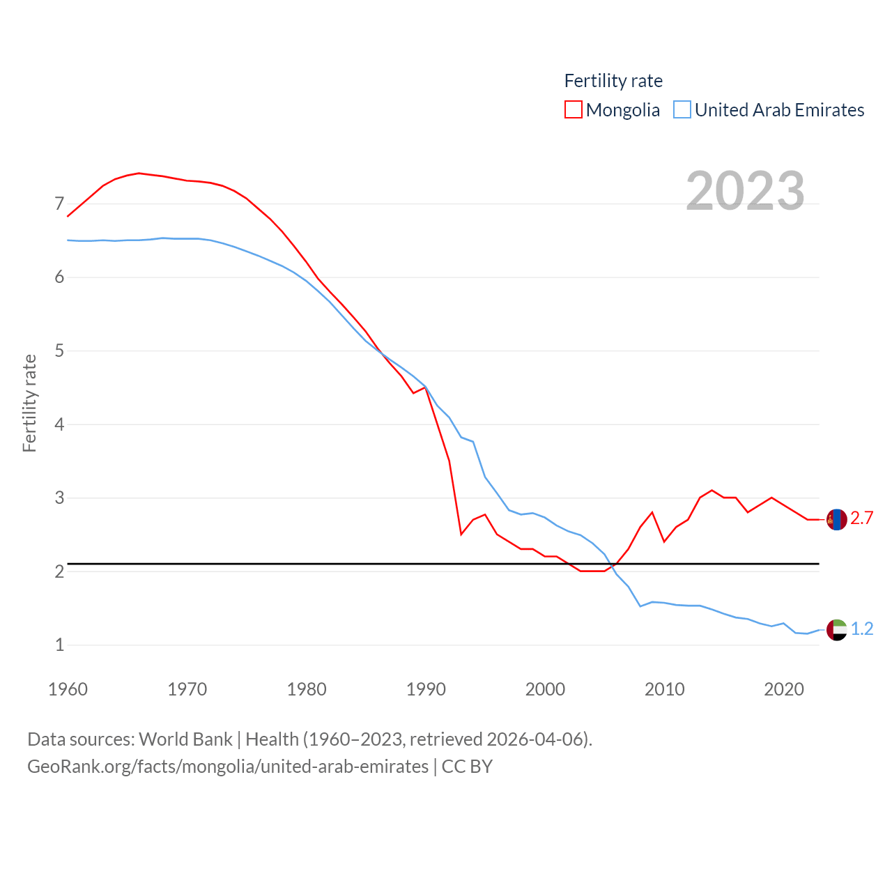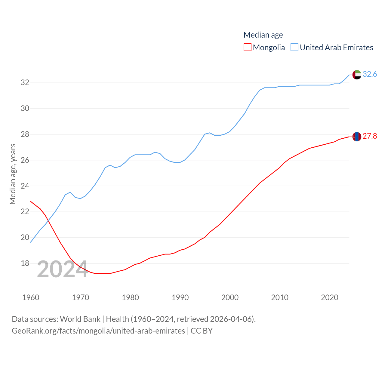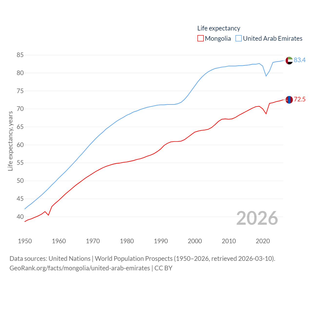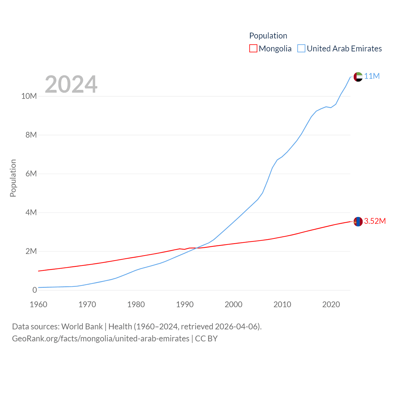 Mongolia has a population of 3.52M (ranked 132/197), compared with 11M in The United Arab Emirates (ranked 86/197). Mongolia's land area is 601,740 sq mi versus 27,421 sq mi for The United Arab Emirates (ranked 18th vs. 117th).