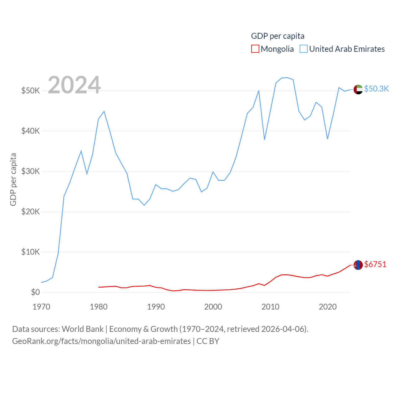 By GDP, Mongolia ranks 121/197 ($23.8B) and The United Arab Emirates ranks 27/197 ($552B). By GDP per capita, Mongolia ranks 105/197 ($6,751), while The United Arab Emirates ranks 24/197 ($50,274).