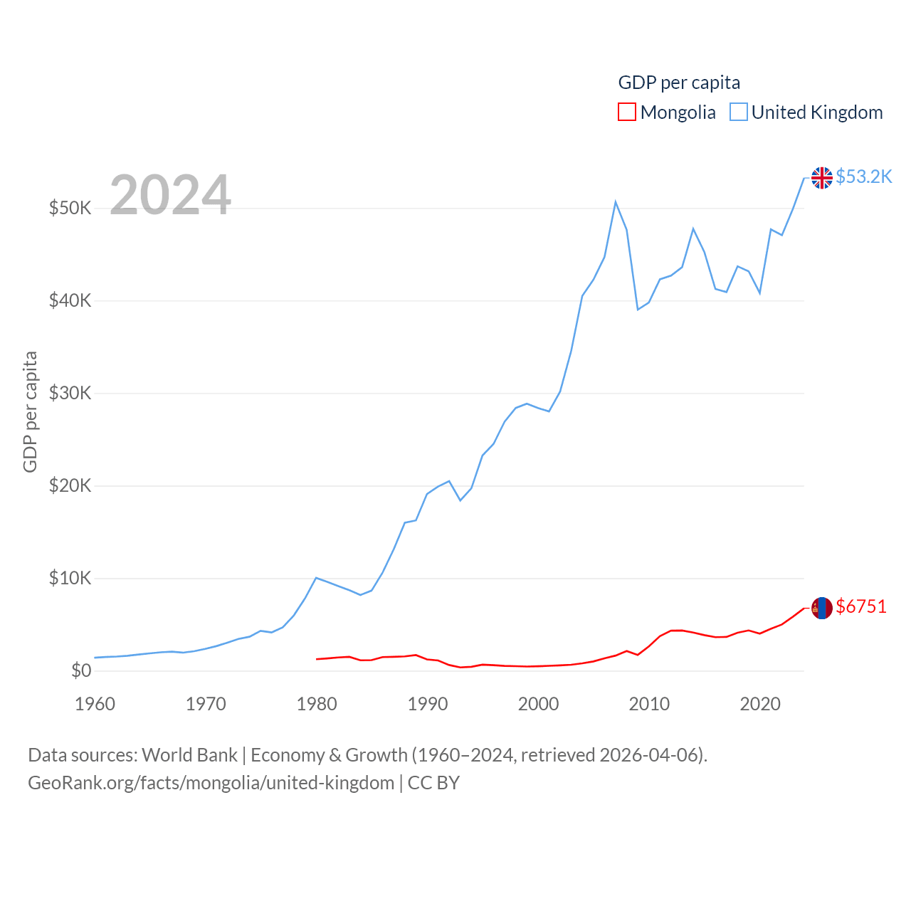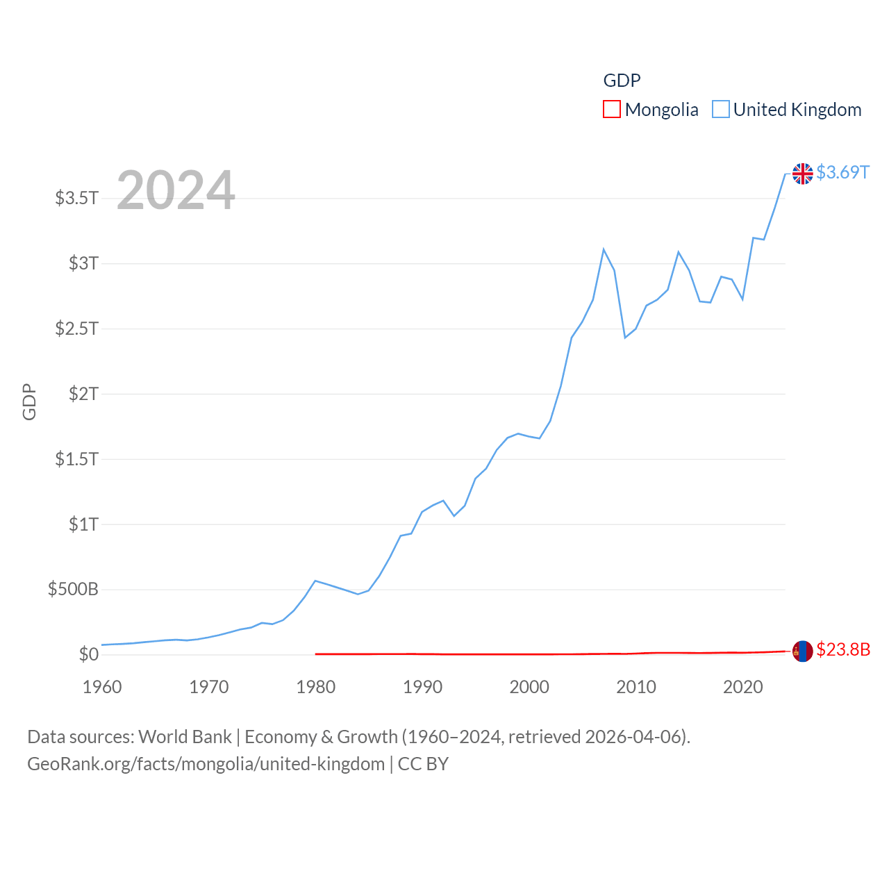 By GDP, Mongolia ranks 121/197 ($23.8B) and The United Kingdom ranks 6/197 ($3.69T). By GDP per capita, Mongolia ranks 105/197 ($6,751), while The United Kingdom ranks 22/197 ($53,246).