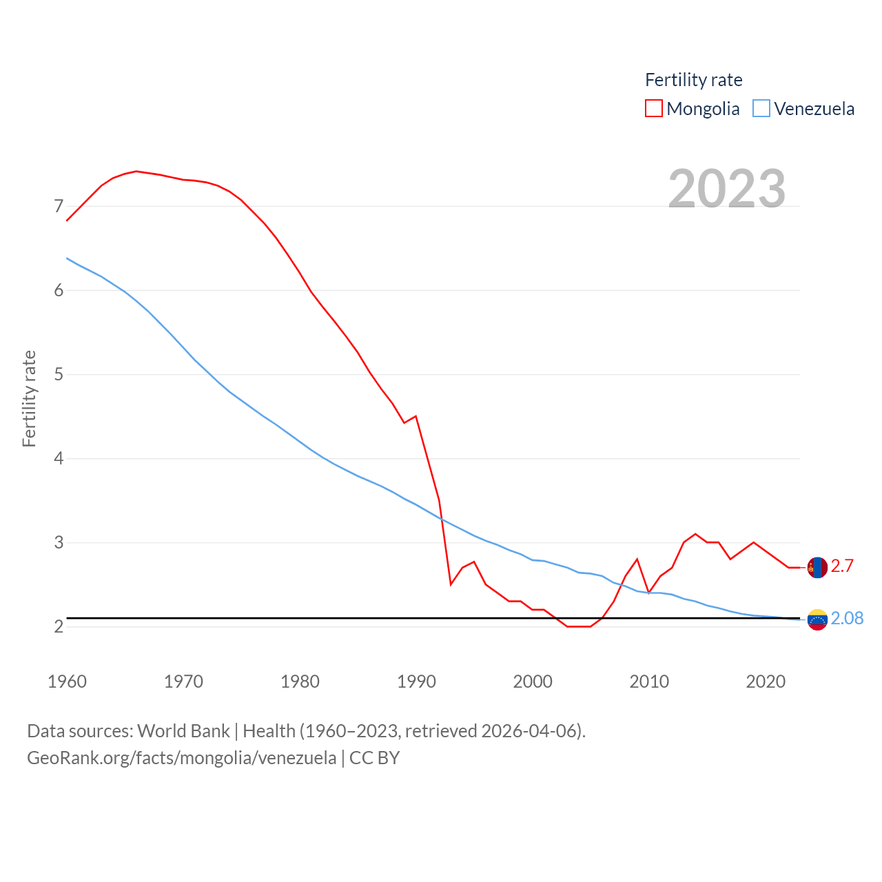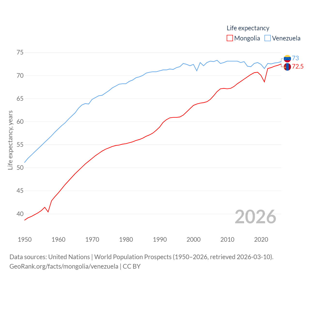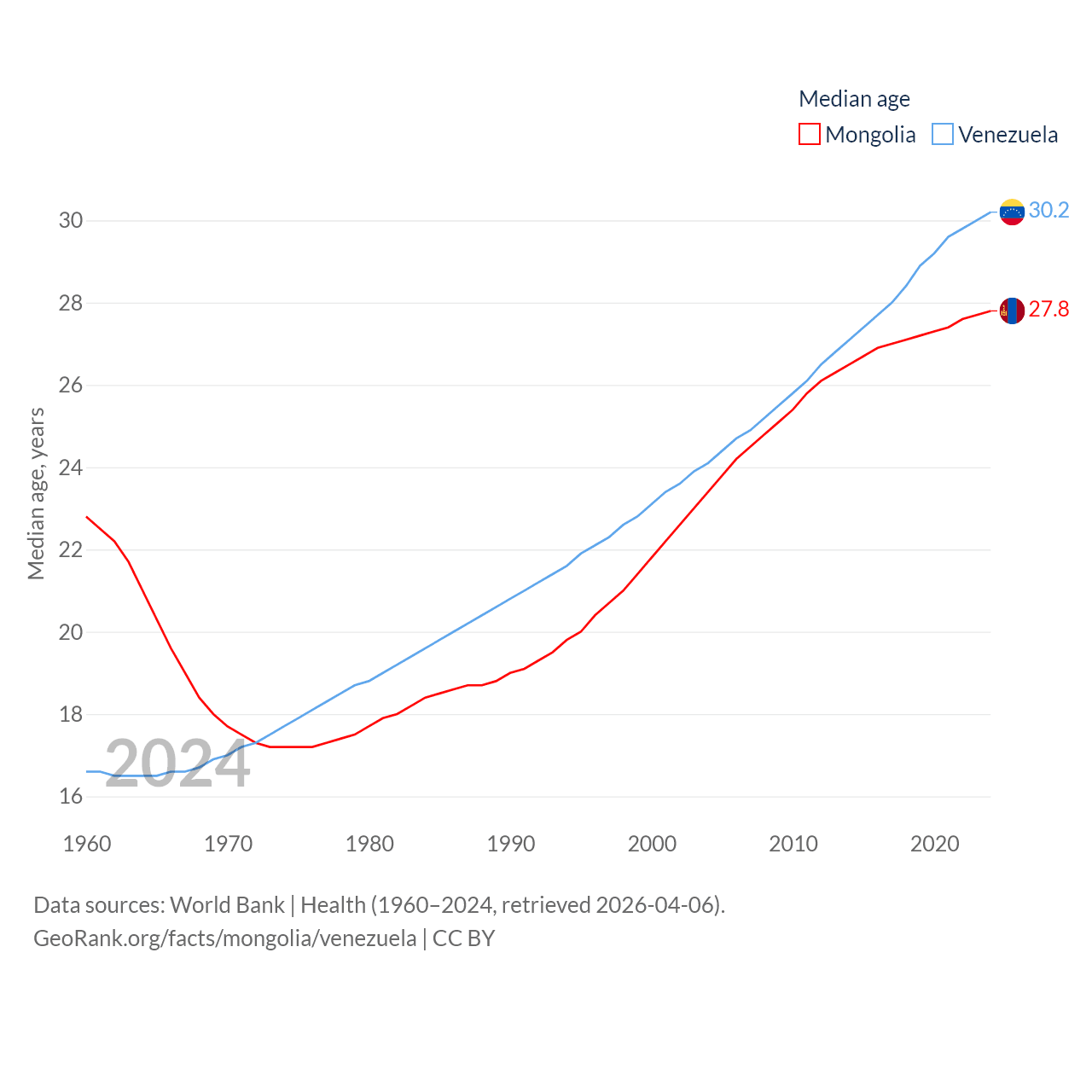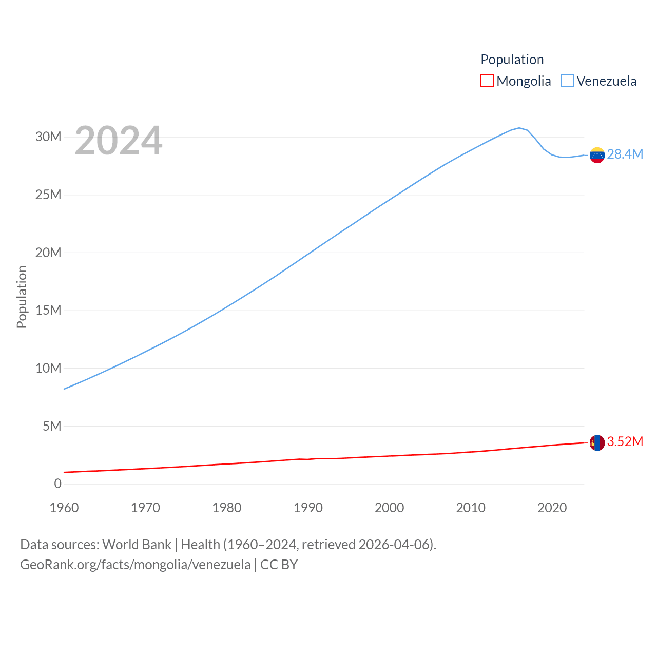 Mongolia has a population of 3.52M (ranked 132/197), compared with 28.4M in Venezuela (ranked 53/197). Mongolia's land area is 601,740 sq mi versus 340,561 sq mi for Venezuela (ranked 18th vs. 32nd).