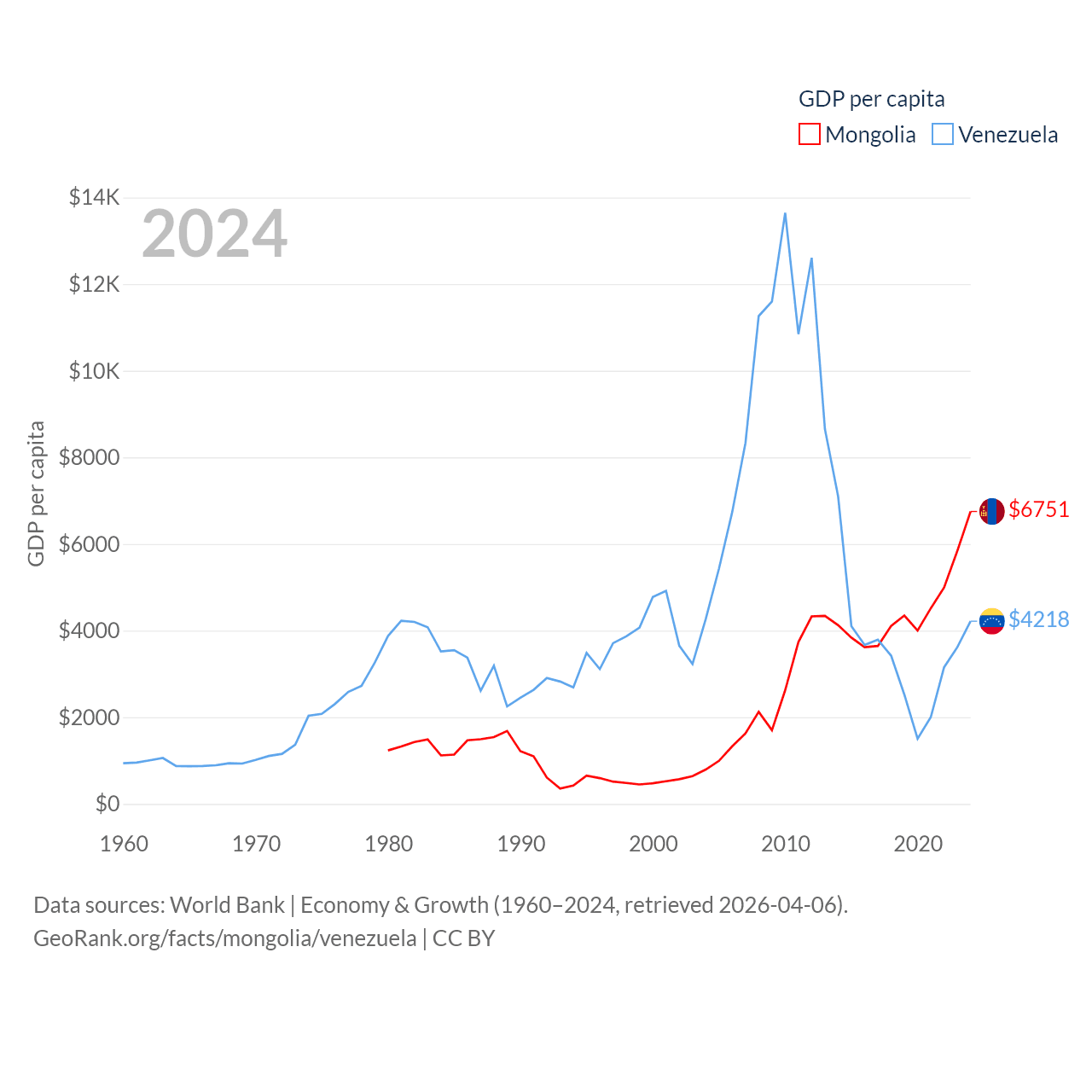 By GDP, Mongolia ranks 121/197 ($23.8B) and Venezuela ranks 65/197 ($120B). By GDP per capita, Mongolia ranks 105/197 ($6,751), while Venezuela ranks 128/197 ($4,218).