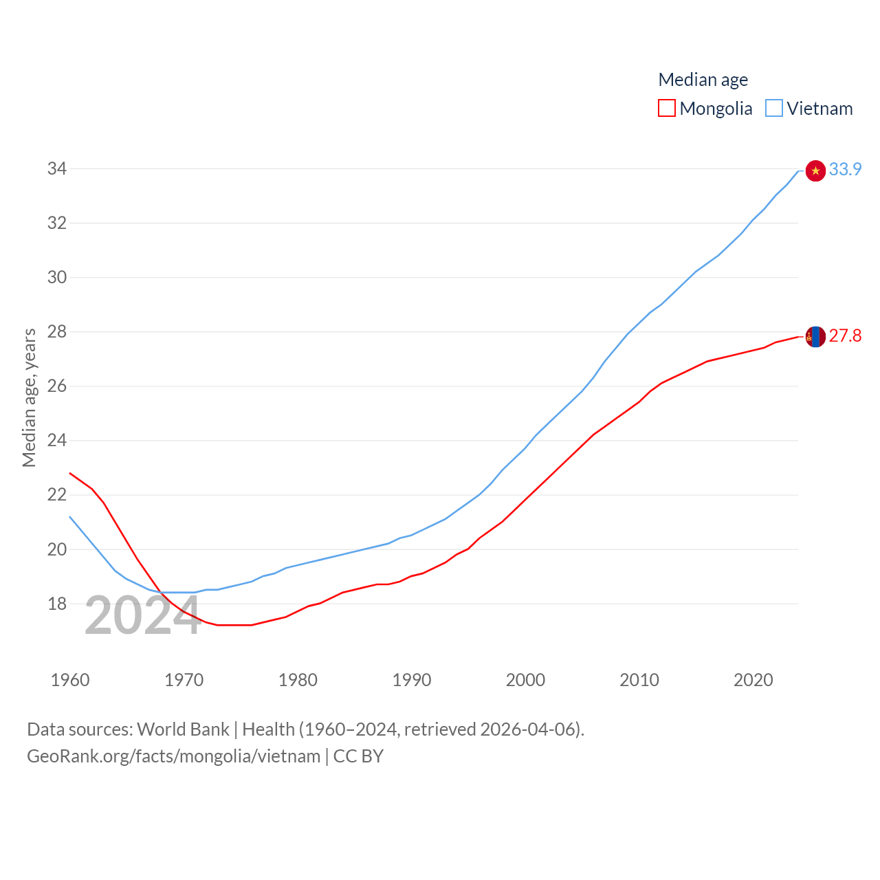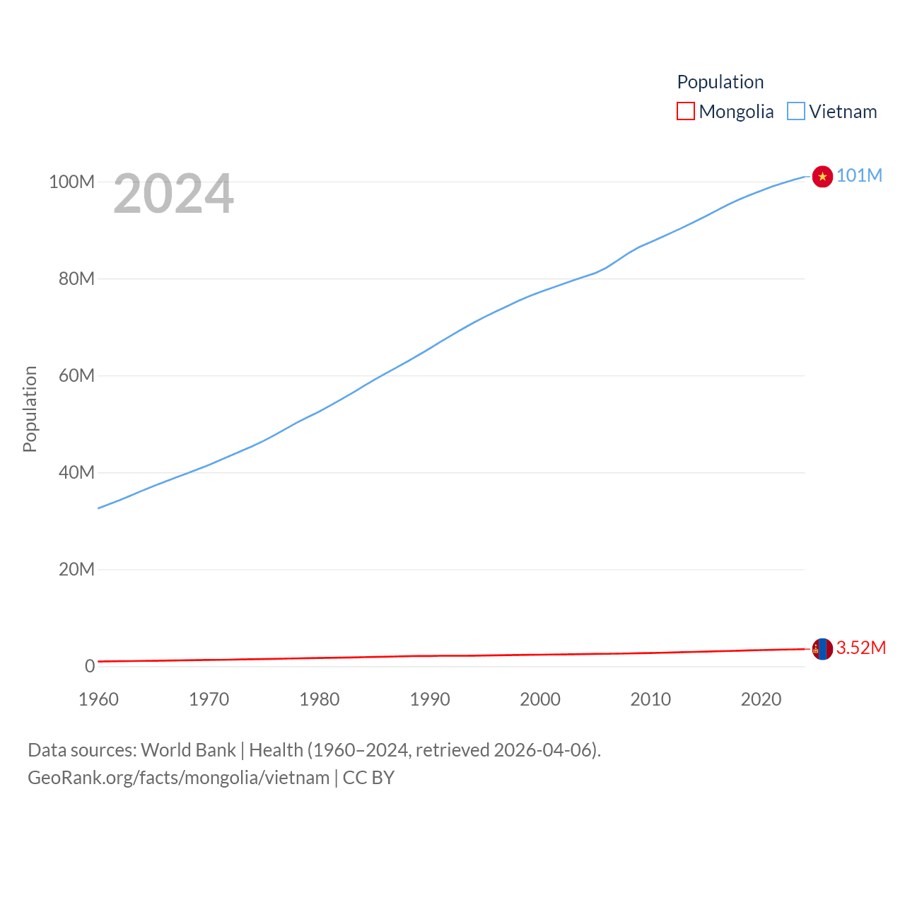 Mongolia has a population of 3.52M (ranked 132/197), compared with 101M in Vietnam (ranked 16/197). Mongolia's land area is 601,740 sq mi versus 121,016 sq mi for Vietnam (ranked 18th vs. 67th).