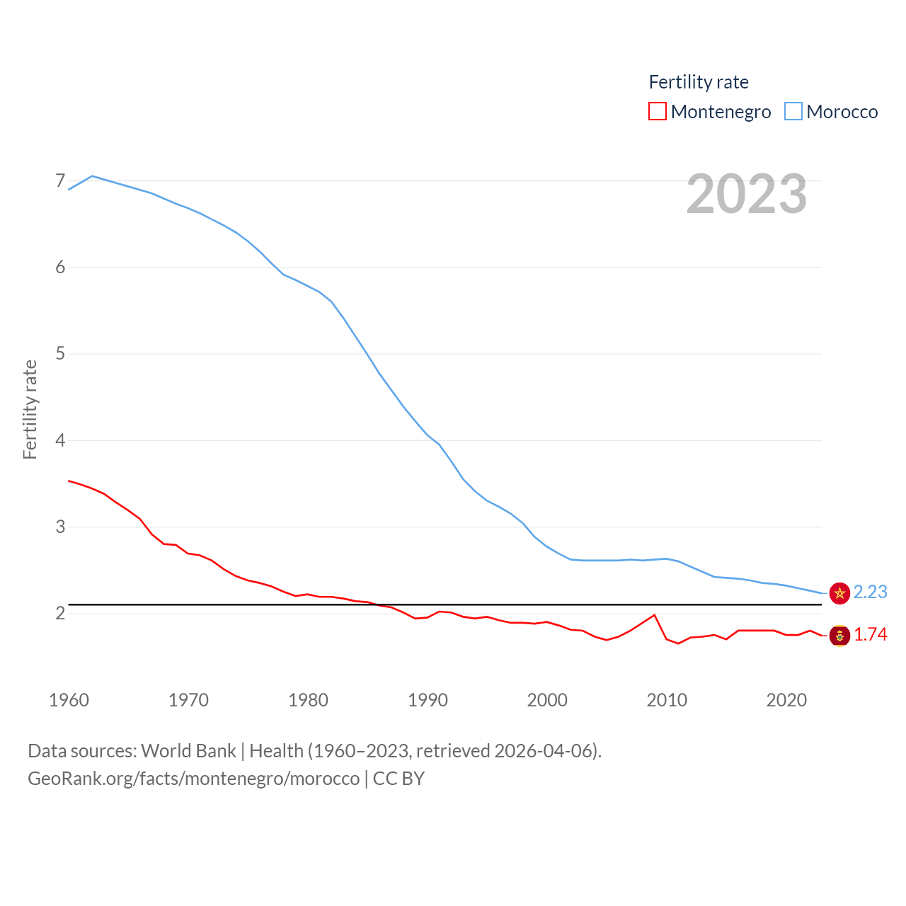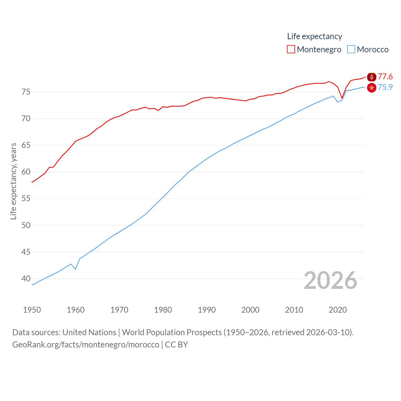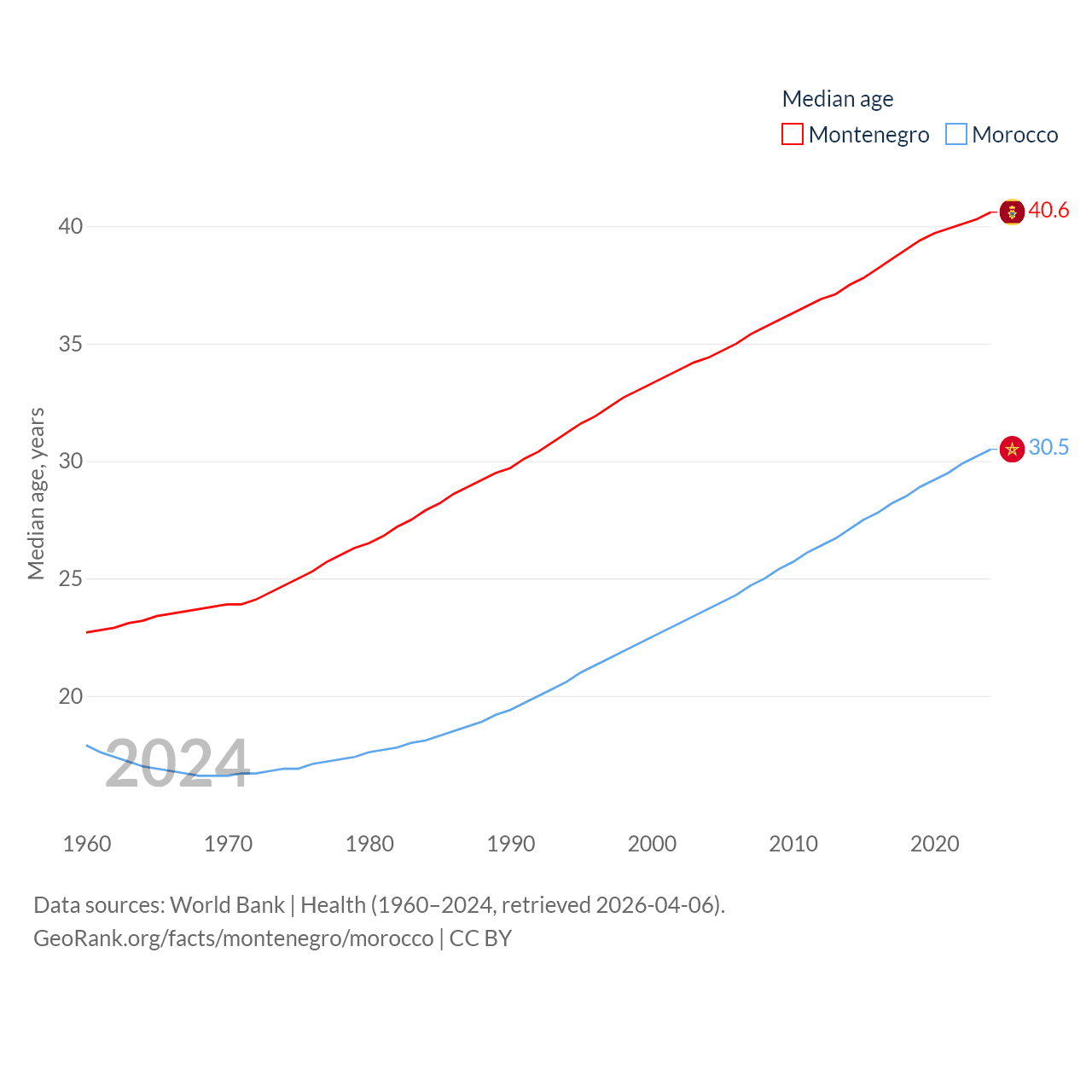 Montenegro has a population of 624K (ranked 166/197), compared with 38.1M in Morocco (ranked 39/197). Montenegro's land area is 5,193 sq mi versus 172,317 sq mi for Morocco (ranked 156th vs. 55th).