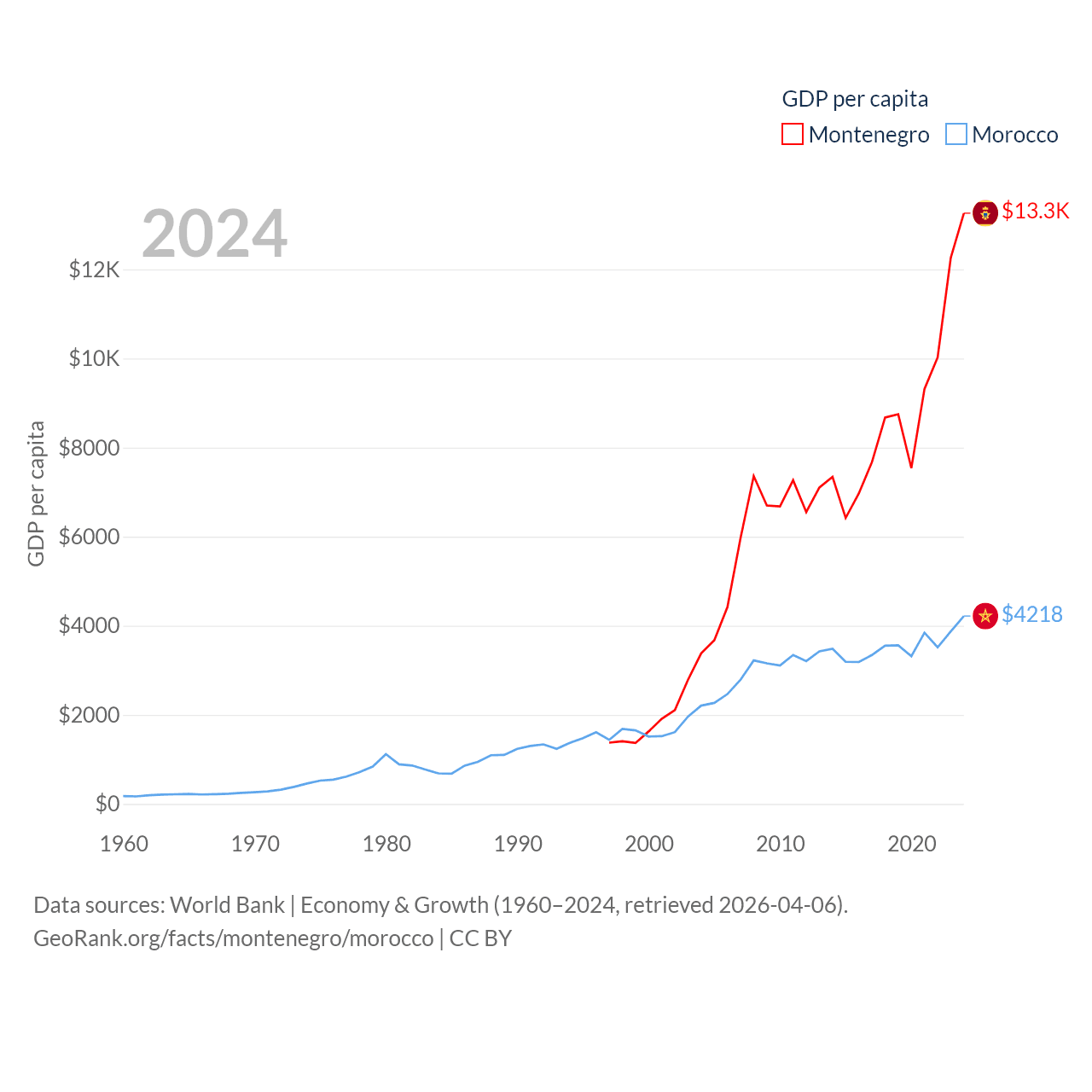 By GDP, Montenegro ranks 155/197 ($8.27B) and Morocco ranks 58/197 ($161B). By GDP per capita, Montenegro ranks 77/197 ($13,263), while Morocco ranks 127/197 ($4,218).