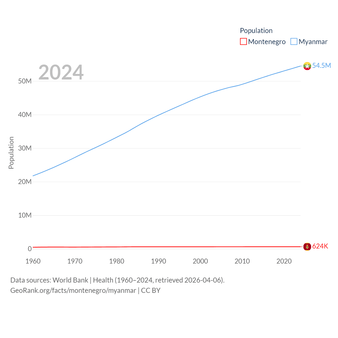 Montenegro has a population of 624K (ranked 166/197), compared with 54.5M in Myanmar (ranked 27/197). Montenegro's land area is 5,193 sq mi versus 251,997 sq mi for Myanmar (ranked 156th vs. 39th).