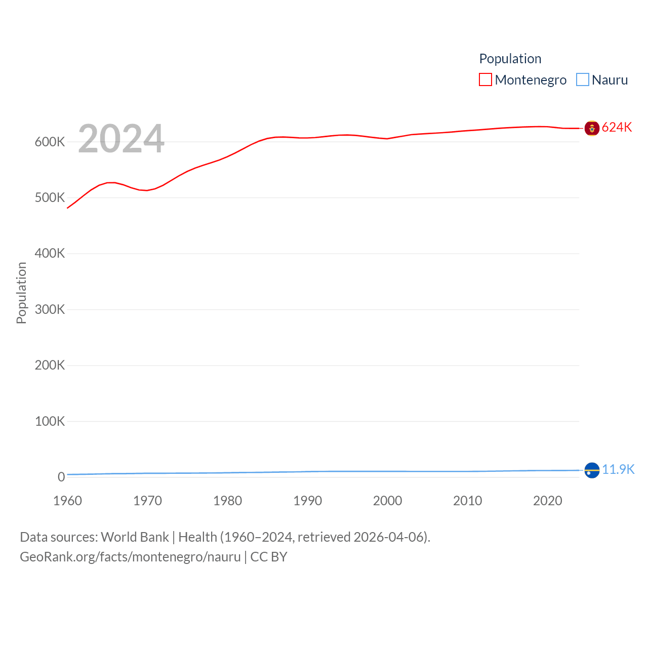 Montenegro has a population of 624K (ranked 166/197), compared with 11.9K in Nauru (ranked 195/197). Montenegro's land area is 5,193 sq mi versus 7.72 sq mi for Nauru (ranked 156th vs. 195th).