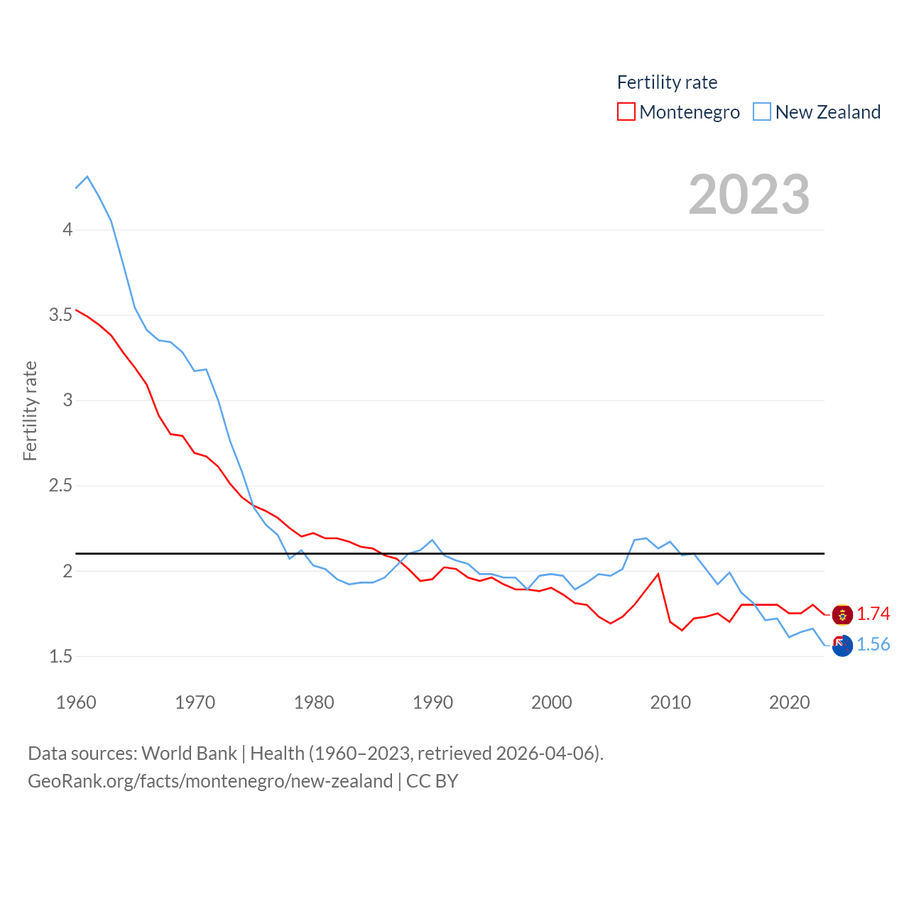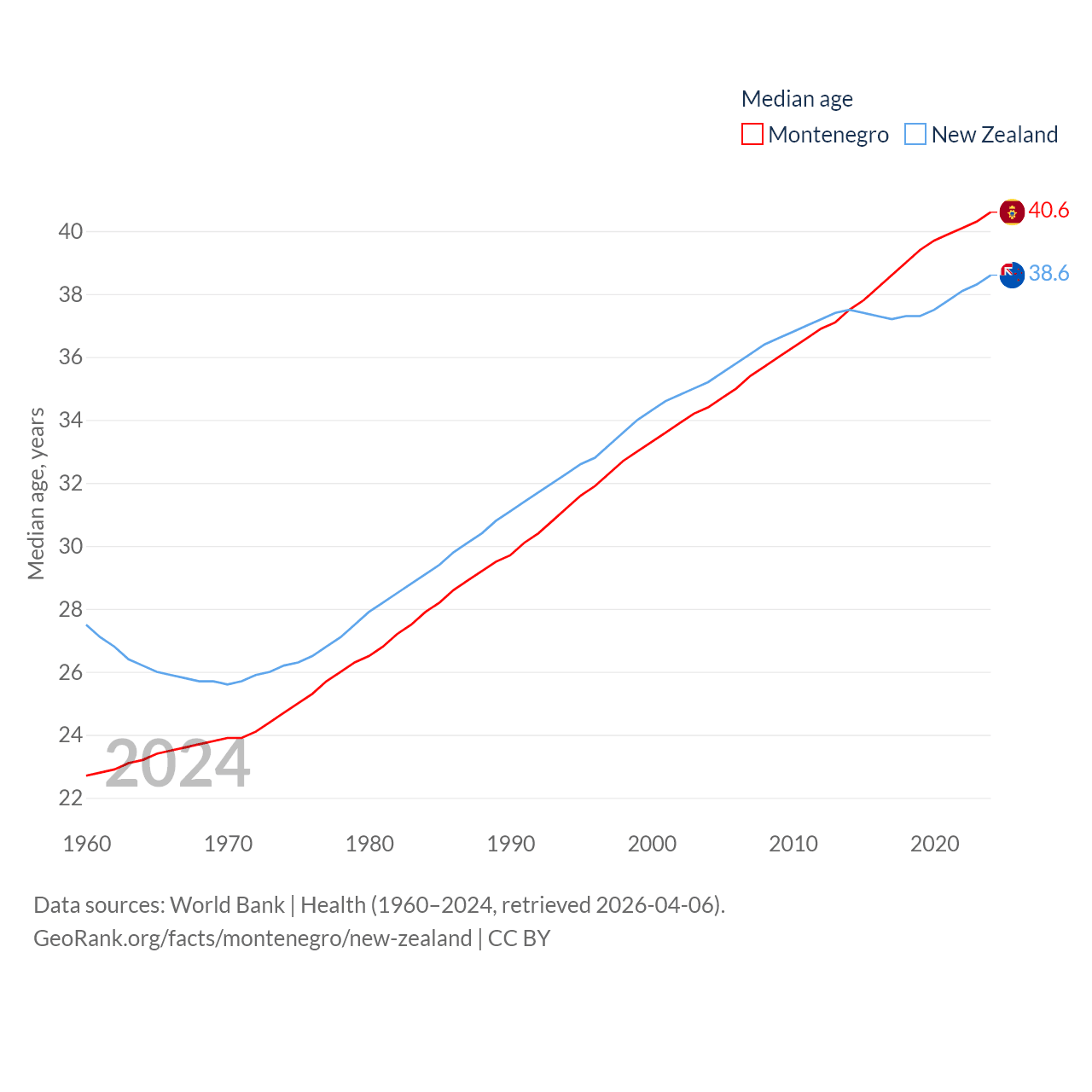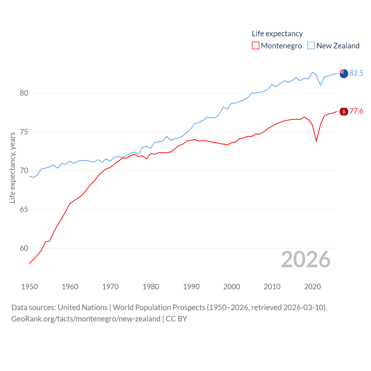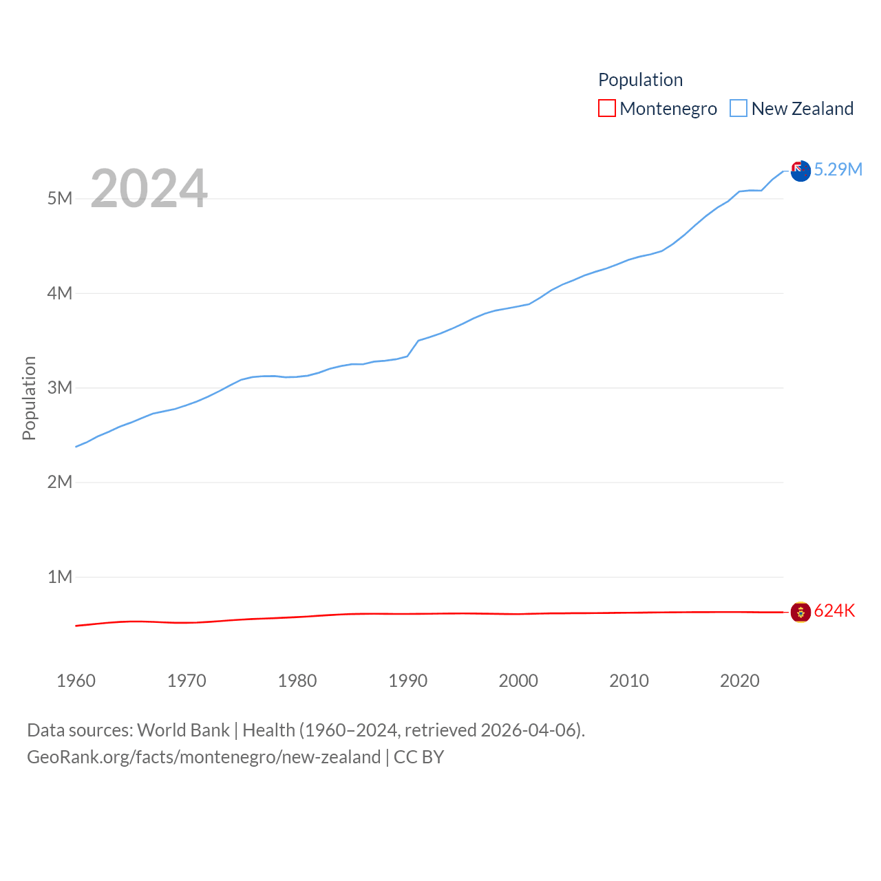 Montenegro has a population of 624K (ranked 166/197), compared with 5.29M in New Zealand (ranked 123/197). Montenegro's land area is 5,193 sq mi versus 101,665 sq mi for New Zealand (ranked 156th vs. 74th).
