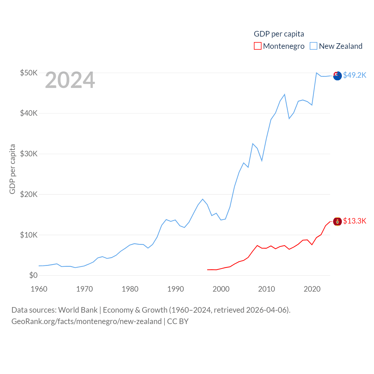 By GDP, Montenegro ranks 155/197 ($8.27B) and New Zealand ranks 52/197 ($260B). By GDP per capita, Montenegro ranks 77/197 ($13,263), while New Zealand ranks 26/197 ($49,205).