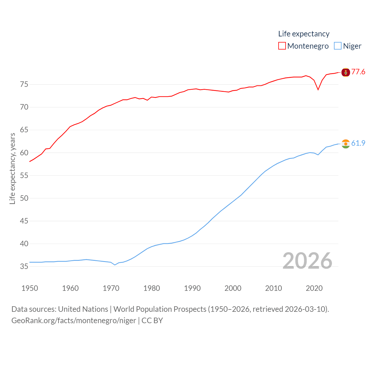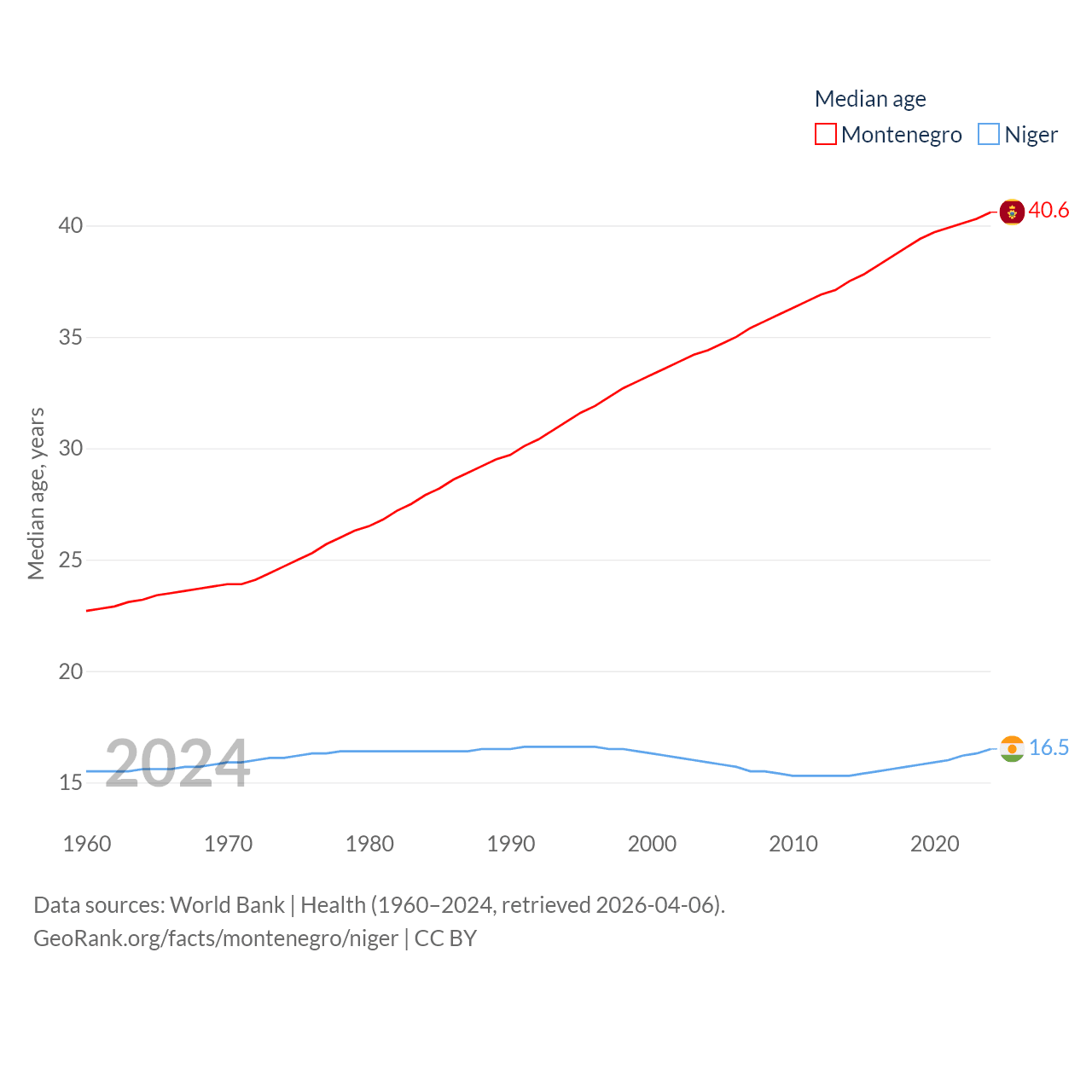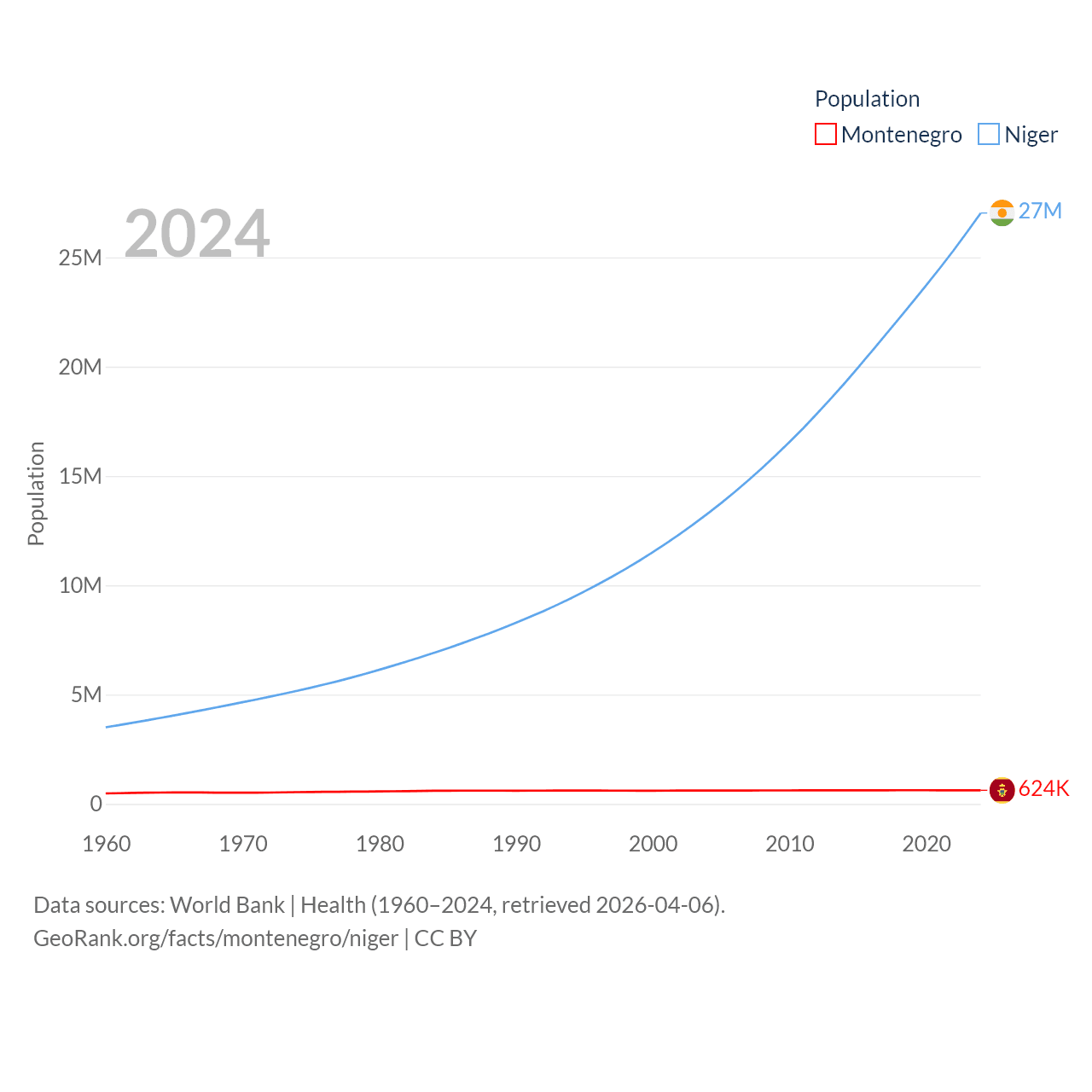 Montenegro has a population of 624K (ranked 166/197), compared with 27M in Niger (ranked 55/197). Montenegro's land area is 5,193 sq mi versus 489,076 sq mi for Niger (ranked 156th vs. 20th).