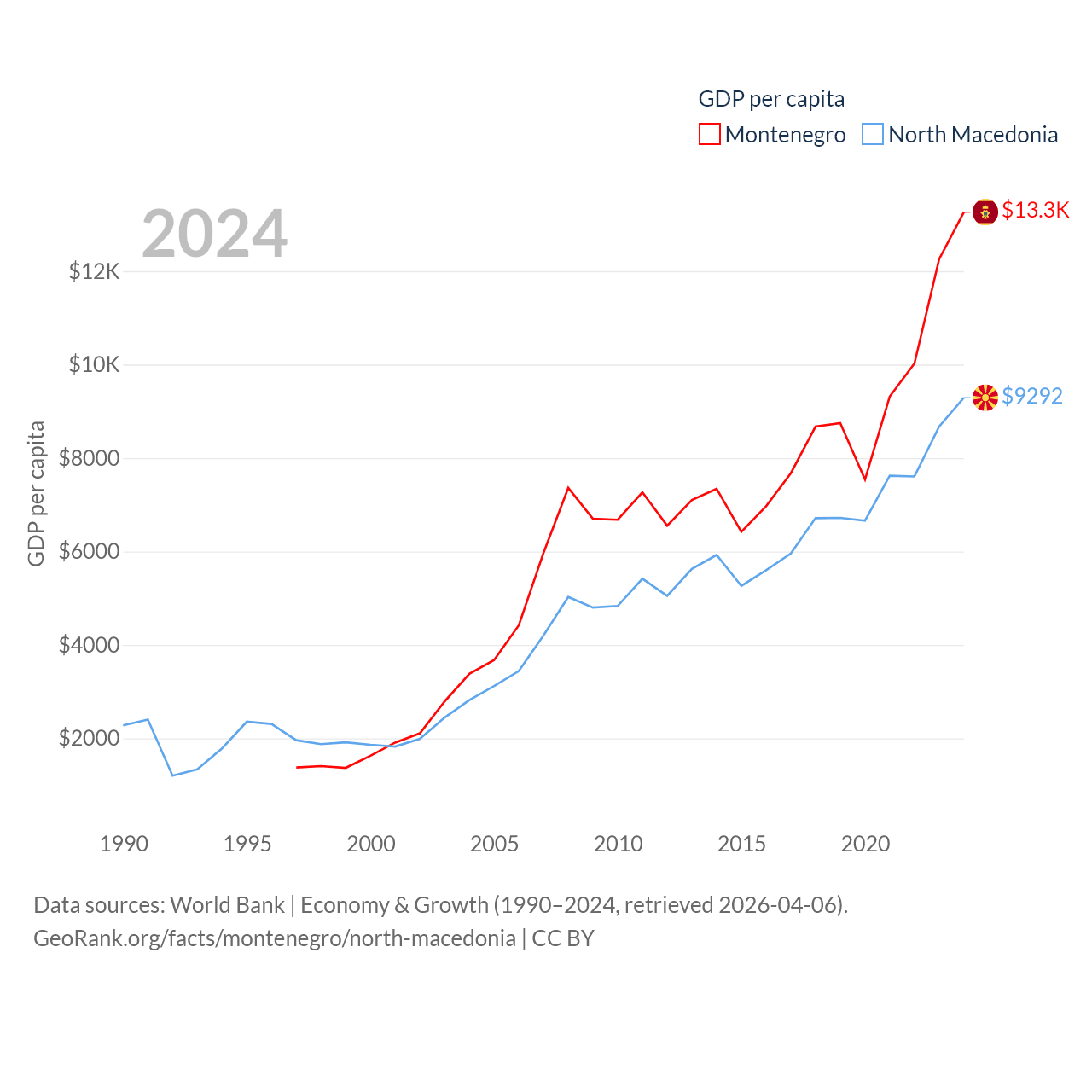 By GDP, Montenegro ranks 155/197 ($8.27B) and North Macedonia ranks 138/197 ($17B). By GDP per capita, Montenegro ranks 77/197 ($13,263), while North Macedonia ranks 88/197 ($9,292).