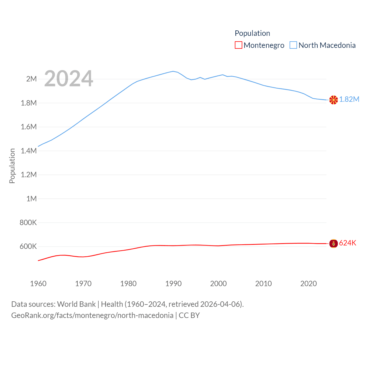 Montenegro has a population of 624K (ranked 166/197), compared with 1.82M in North Macedonia (ranked 150/197). Montenegro's land area is 5,193 sq mi versus 9,737 sq mi for North Macedonia (ranked 156th vs. 145th).